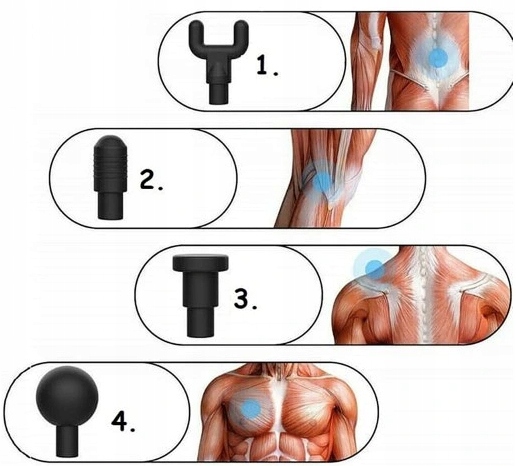 - 4 сменных насадки: для различных мест массажа / группы мышц