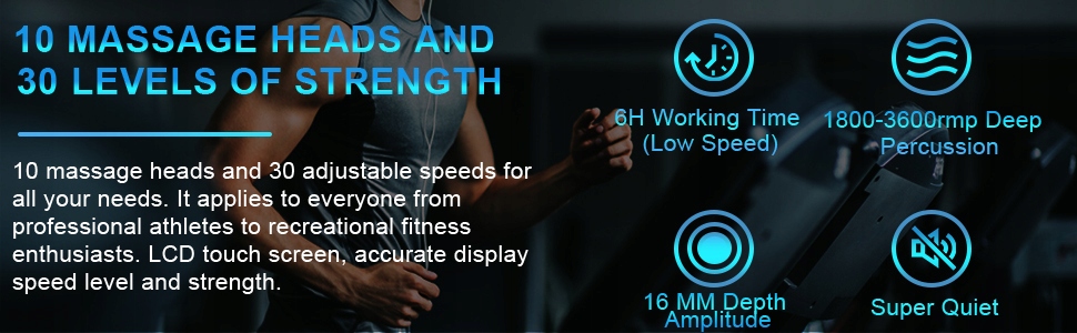 - 30 скоростей и сенсорный ЖК-экран: с 30 регулируемыми уровнями скорости (1800 – 3600 перкуссий/мин.) Вы можете выбирайте любую скорость в зависимости от силы болезненности или боли. В то же время наш вибрационный ударный массажер оснащен сенсорным ЖК-экраном, уровнями скорости и количеством электроэнергии.