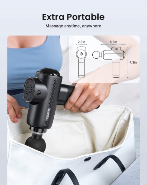 Портативный футляр позволяет легко хранить и транспортировать массажный пистолет и его аксессуары. Этот массажный пистолет для глубоких тканей имеет небольшой и компактный дизайн и весит всего 680 г. > Идеально подходит для мобильного использования на открытом воздухе и во время путешествий.