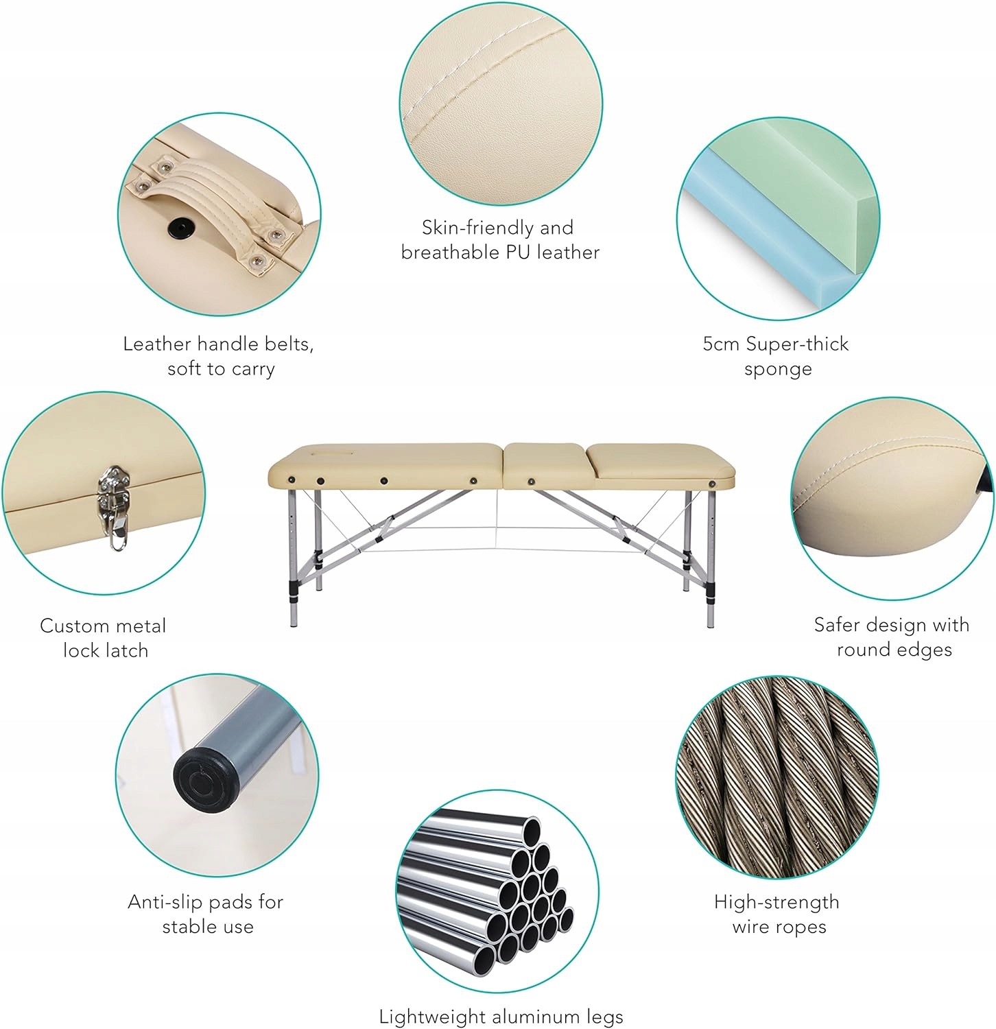 Благодаря используемым материалам складной широкий массажный стол весом всего 14,3 кг не только легко транспортировать, но и легко хранить. Кроме того, прочные алюминиевые ножки и масло- и водостойкая искусственная кожа легко чистятся.