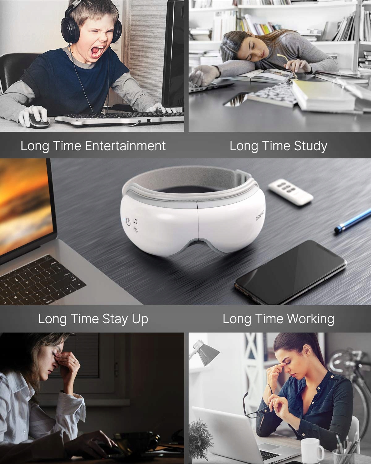 Прибор для массажа глаз RENPHO стимулирует различные акупунктурные точки в области глаз посредством мягкого надавливающего массажа. Тепловое давление улучшает кровообращение в области глаз и положительно влияет на темные круги под глазами, слезы и хронические головные боли. Для лучшего самочувствия глаз используйте массаж глаз (для). Это также креативный подарок для друзей и семьи. Его используют все возрастные группы: молодые люди, которые (чрезмерно) слишком много играют со своим мобильным телефоном или планшетом, а затем становятся близорукими. Сотрудники Bäro, которые каждый день сидят перед компьютером и имеют м()де глаза. ü Пожилые люди с сухими глазами и люди, находящиеся в состоянии стресса или имеющие проблемы со сном ü.