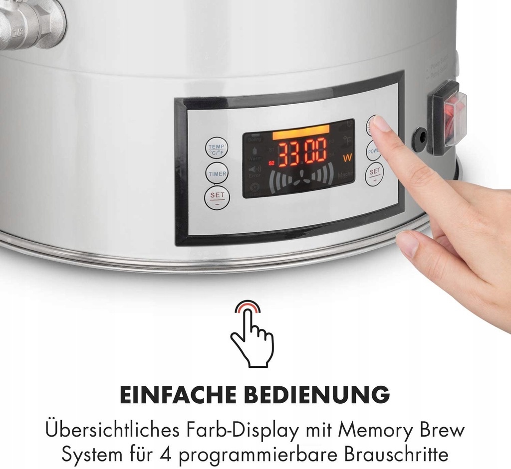 Понятная панель управления с цветным дисплеем позволяет вручную устанавливать температуру, время заваривания и мощность; альтернативно вы можете использовать новую систему MemoryBrew. Вам просто нужно запрограммировать четыре этапа процесса пивоварения – благодаря этому вы получите одинаковые результаты даже при нескольких процессах пивоварения. Нагреватель мощностью от 500 до 1600 Вт доводит брагу до кипения, при температуре от 30 до 140°С.