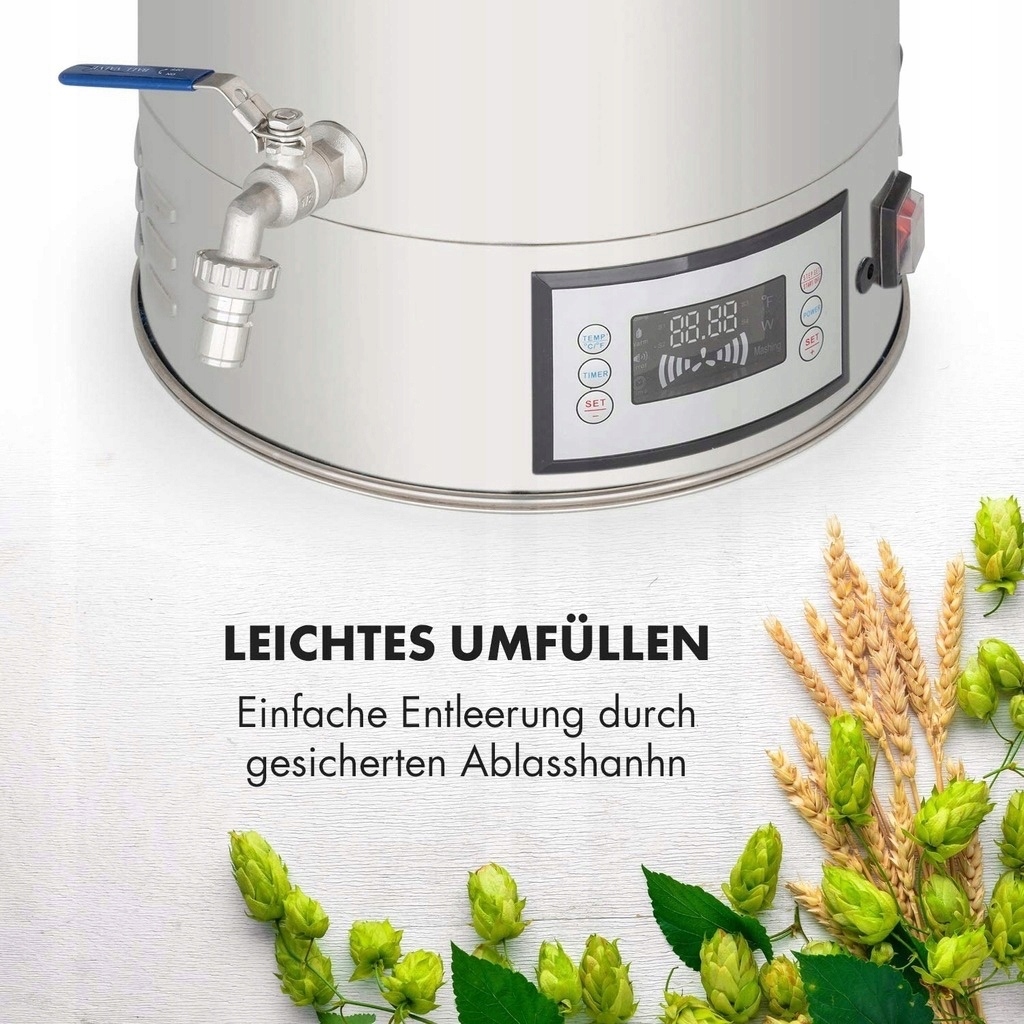 Заторный котел One Concept Hopfengott 10033077 - позволяет получить базовый экстракт сусла для производства светлого и темного пива, верхнего и нижнего брожения, пшеничного или пилснерского типа. Даже любители наверняка смогут получить отличное, освежающее пиво! Благодаря двум разным размерам каждый сможет найти подходящий котел.