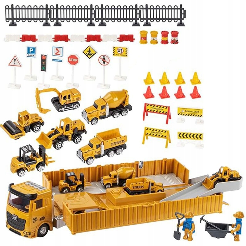 - Богатый набор аксессуаров - В комплект входят конусы, бочки, предупреждающие знаки, барьеры и строительные фигурки, которые обогащают удовольствие и позволяют создать полноценную строительную площадку или погрузочную станцию для эвакуатора.