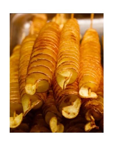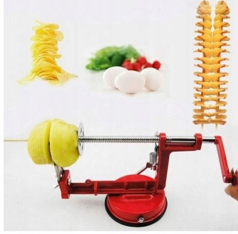 Ручная машинка позволяет быстро и легко нарезать картофель колечками. Это специально нарезанный на палочке картофель, который затем обжаривают в горячем масле в течение 3-4 минут и подают с различными специями.