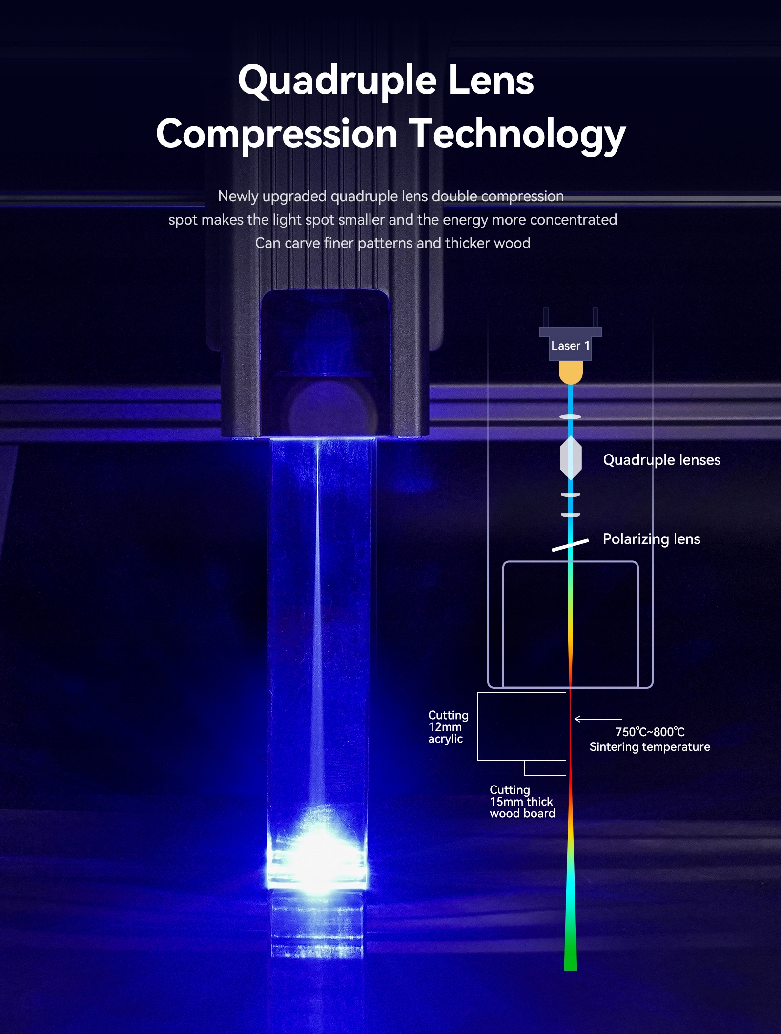 В лазере используется 4-кратная технология коллимации и фокусировки группы линз, оптическая мощность составляет 5,5-6 Вт, а зона фокусировки лазера уменьшена до 0,06*0,06 мм. Лазер высокой плотности может легко резать деревянные доски толщиной 15 мм, черный акрил толщиной 12 мм; Он может напрямую гравировать зеркальный металл и керамику из нержавеющей стали, а также достигать эффекта CO₂-лазерного гравировального станка мощностью 100 Вт.