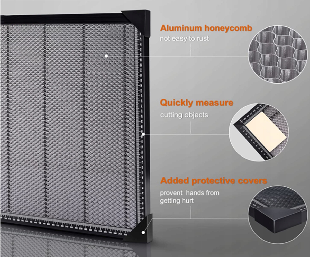 Сотовый рабочий стол изготовлен из высококачественных алюминиевых сот, металлических опор и рамы, которые не только прочны и долговечны, но и не поддаются коррозии. Благодаря превосходному качеству изготовления сотовая поверхность гладкая и плоская, а сотовые отверстия имеют одинаковый размер. Ускоряет выделение дыма и обеспечивает лучшие результаты резки. Это незаменимая часть станков для лазерной резки и гравировки. Сотовую пластину можно использовать для предотвращения повреждения лазерной головки отражением лазера во время процесса резки и продления срока службы лазера.