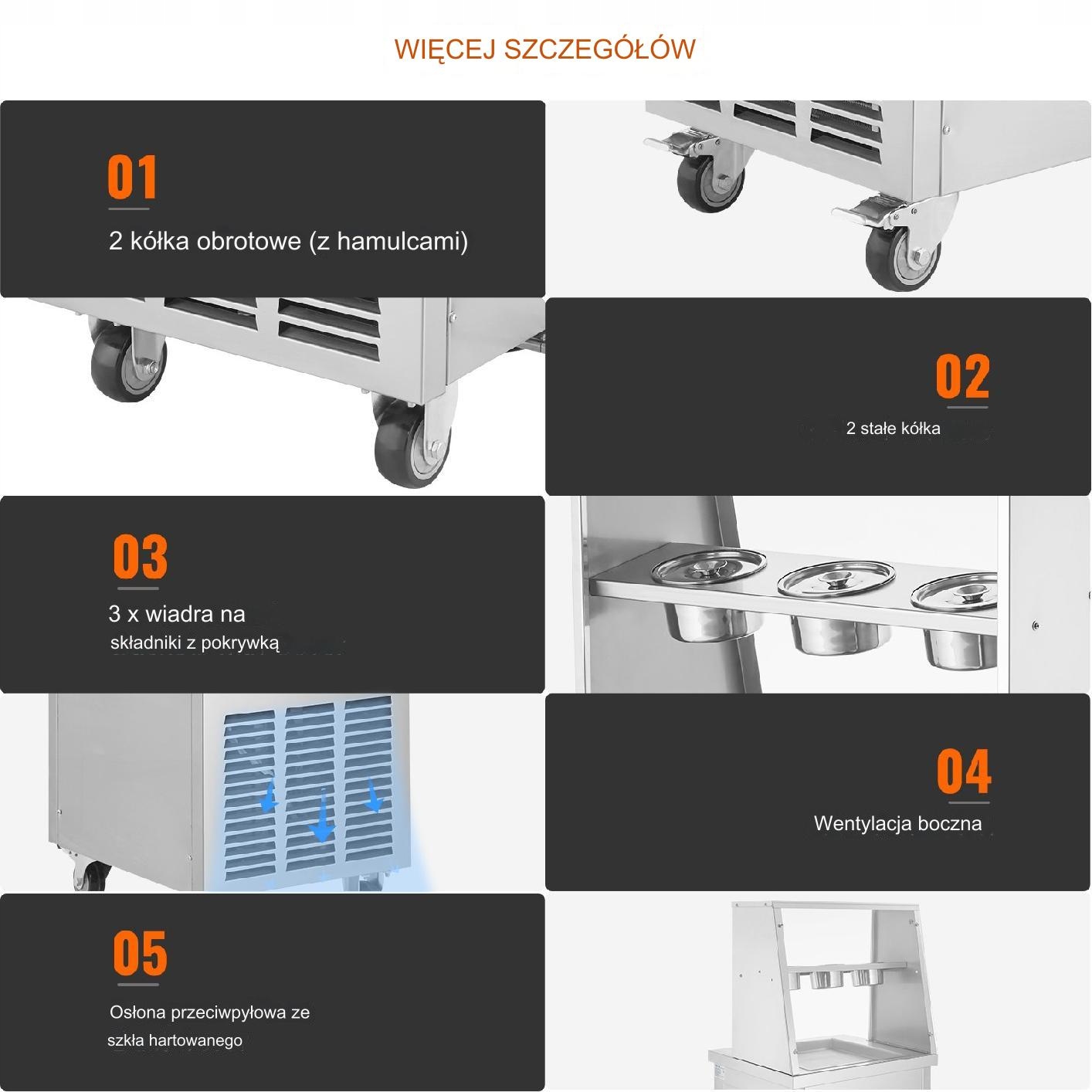 Мороженица оснащена 4 колесами, включая тормоза, что позволяет легко перемещать ее в разные места. Дополнительные аксессуары, такие как лопаточки, контейнеры для ингредиентов и мерные стаканчики, делают приготовление мороженого более быстрым и эффективным.