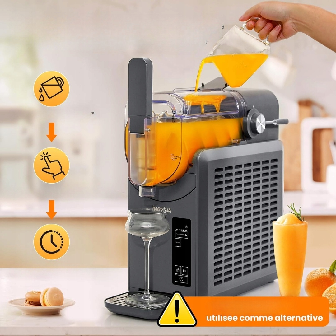 Вы мечтаете о идеальной слякотике, коктейле или замороженном десерте без необходимости дробления лед? С машиной Inoviva S1.0 вы готовите освежающие напитки через несколько мгновений! Благодаря встроенному компрессору устройство работает полностью автоматически - просто вылейте жидкость, выберите программу и наслаждайтесь идеальным напитком ❄.
