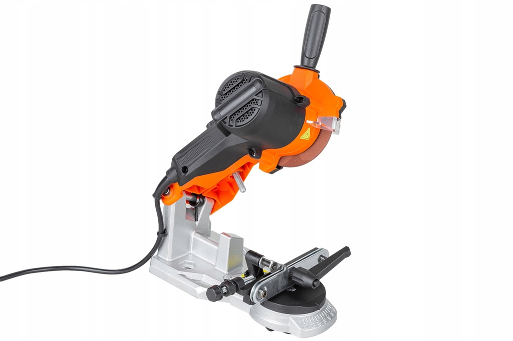 Плавная регулировка натяжения цепи и регулировка угла заточки с точной шкалой позволяют многократно затачивать каждое звено без необходимости чрезмерного натяжения. Точилка оснащена вращающимися тисками с регулируемым углом заточки (угол поворота 35 градусов) и ограничителем глубины заточки, что позволяет очень точно заточить цепь