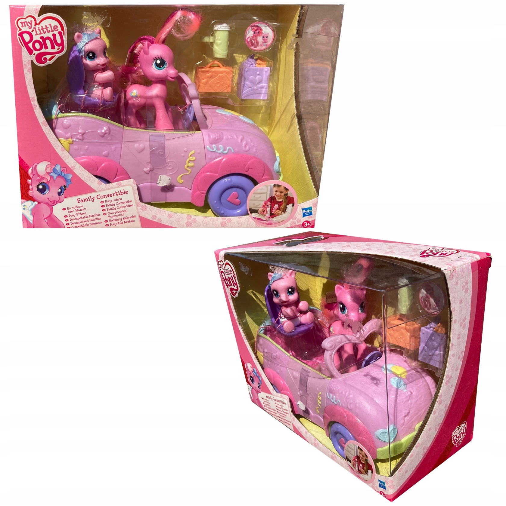 Это набор машин-кабриолетов My Little Pony Family с 2 фигурками. Автомобиль имеет длину 1/2 дюйма и высоту 5 дюймов. Дверь открывается. В набор входят 2 фигурки: Мама Пай и новорожденная Милая Пинки Пай.
