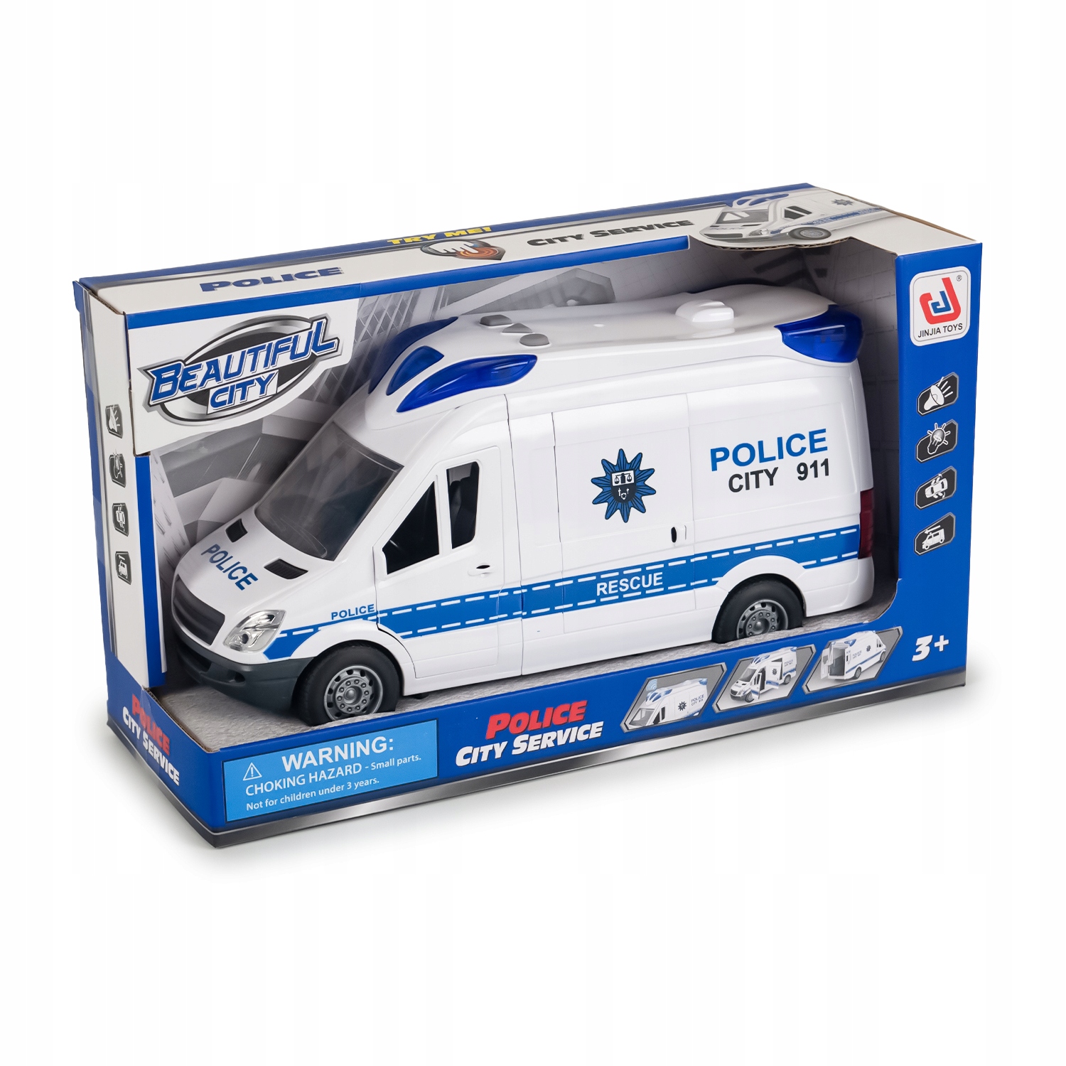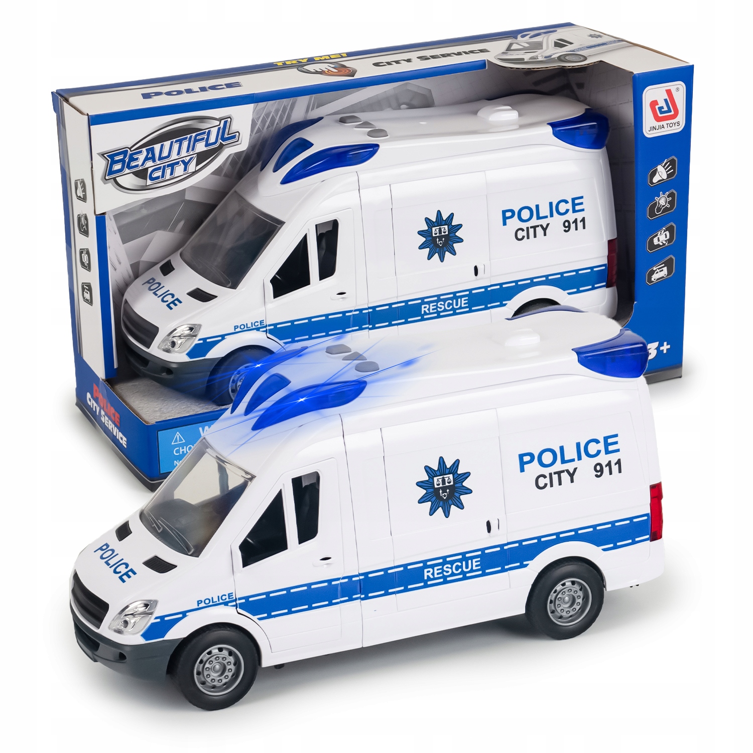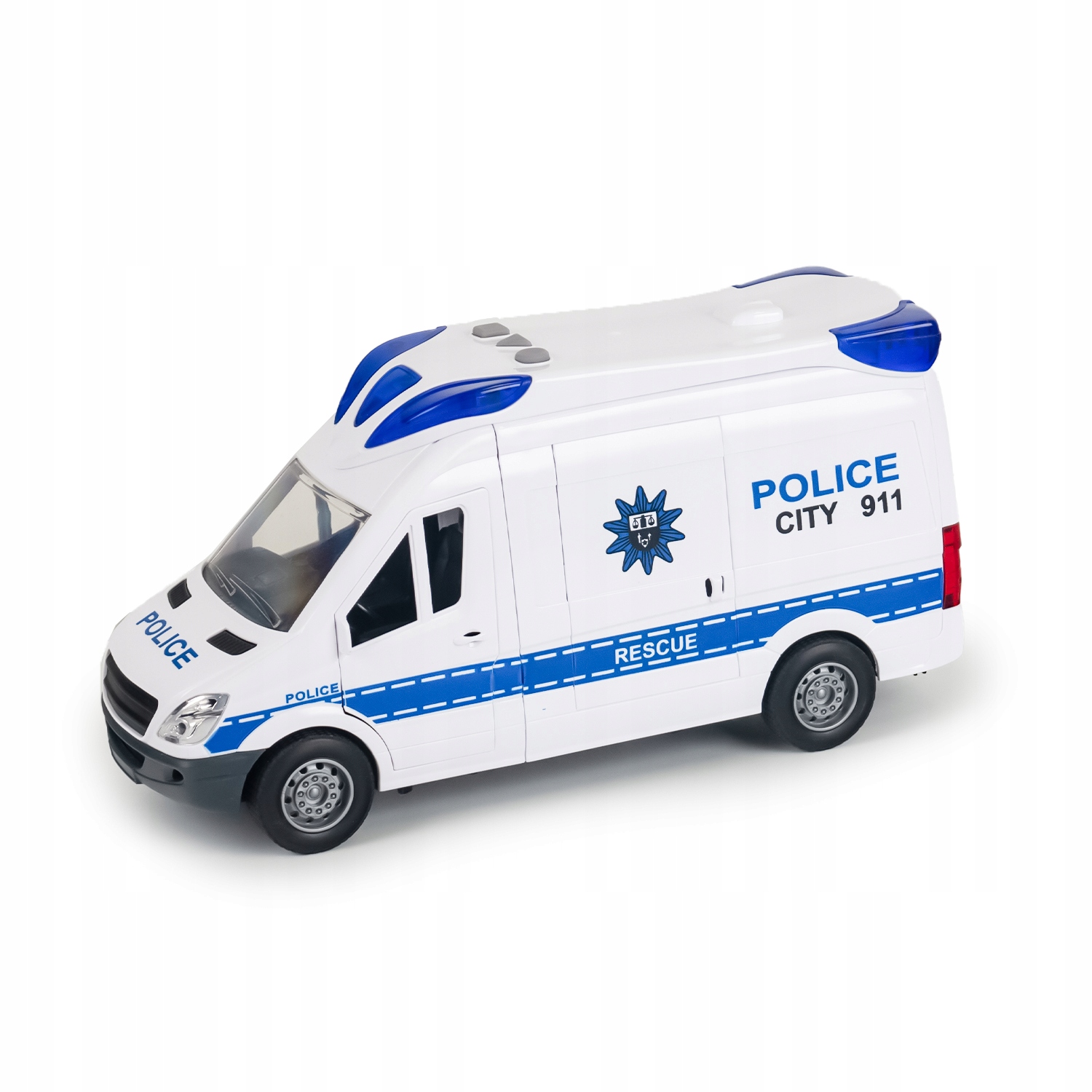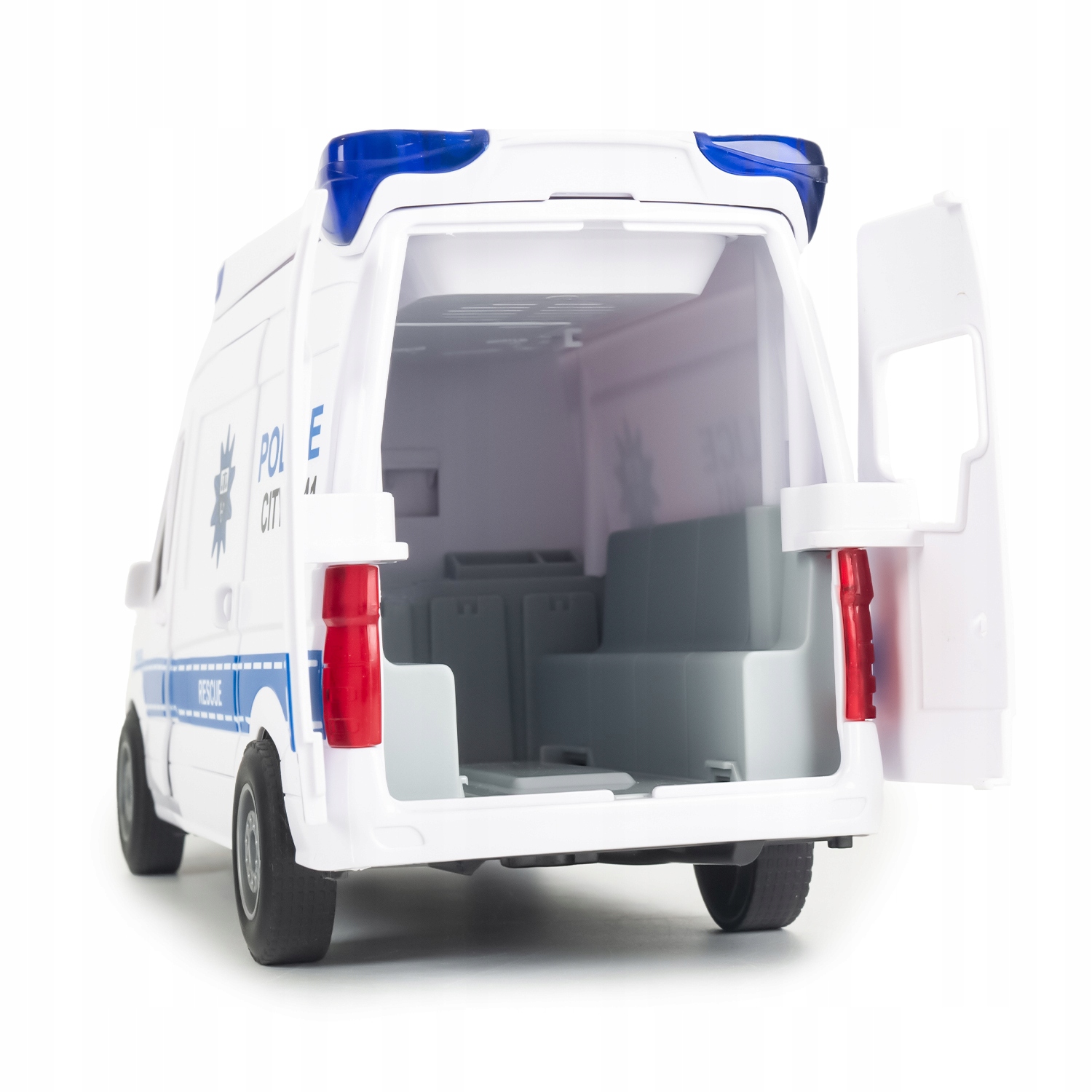 Тщательно продуманные детали, такие как белые корпуса с контрастными синими элементами и подсветкой, реалистичные резиновые шины и точное воспроизведение важных частей автомобиля, делают эту игрушку, которая привлечет внимание каждого ребенка.