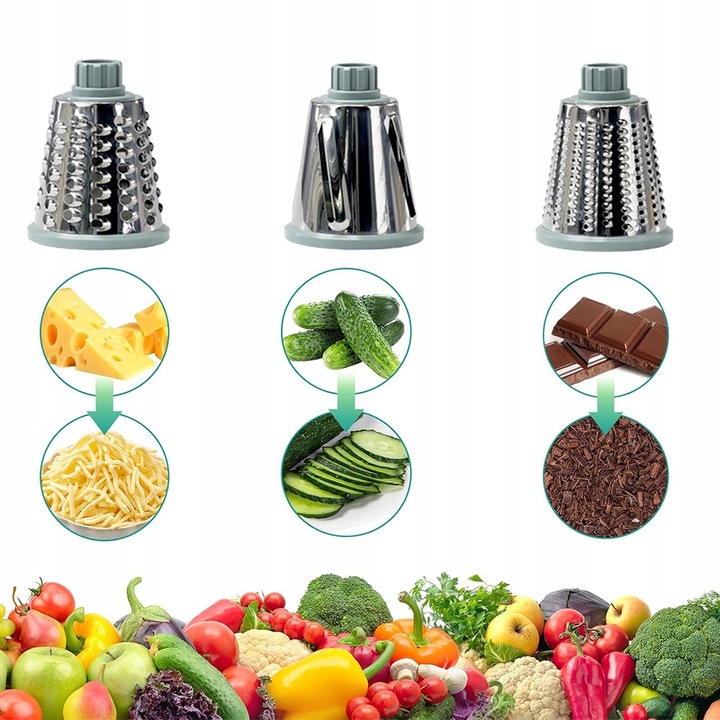 【Сырный измельчитель】 оснащен 3 барабанными лопастями для нарезания, раздавливания и измельчения различных ингредиентов. Идеально подходит для сыра, редьки, моркови, огурцов, картофеля, пирожных, шоколада, брокколи, салатов и аксессуаров для пиццы. Советы: Используйте нарезанную терпение для мягкого сыра, для твердого сыра - настаньте для разрезания на небольшие кубики.