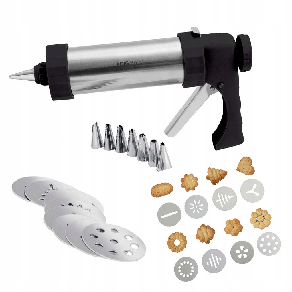 Изготовлена из высококачественной полированной стали известного немецкого бренда KingHoff. Оснащена 8 дисками для печенья и 8 насадками, которые позволяют украшать сладкие лакомства. Легко чистить и использовать. Декоратор можно наполнить вкусным кремом для начинки печенья, а также горчицей или майонезом. Идеально подходит для праздничной выпечки.