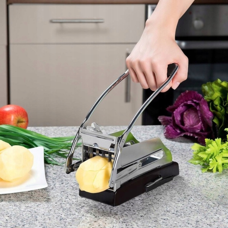 с домашним картофелем фри толщина нарезанного картофеля очень важна, так что они не слишком густые и слишком тонкие, хорошая фри - основание для правильного приготовленного картофеля фри, так что они напоминают те, кто из фаст -фуда, нашу машину идеально подходит для "бельгийского" фри " правило, как пицце Поэтому специальная машина - это основа