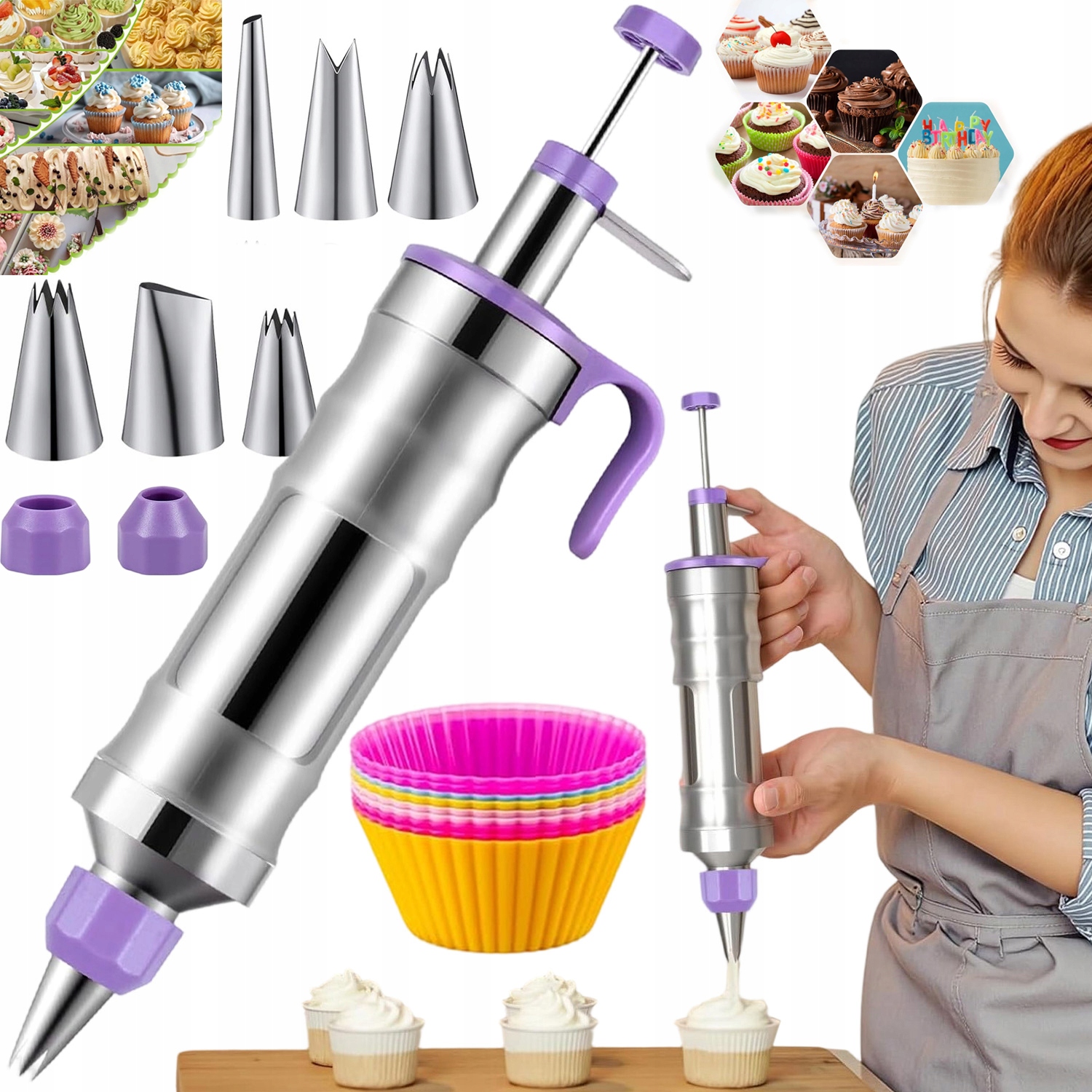 В комплект входит пистолет для глазури, 6 сменных насадок для глазури и 9 силиконовых форм для кексов. Эти инструменты для украшения тортов удовлетворят ваши потребности в украшении тортов и печенья.