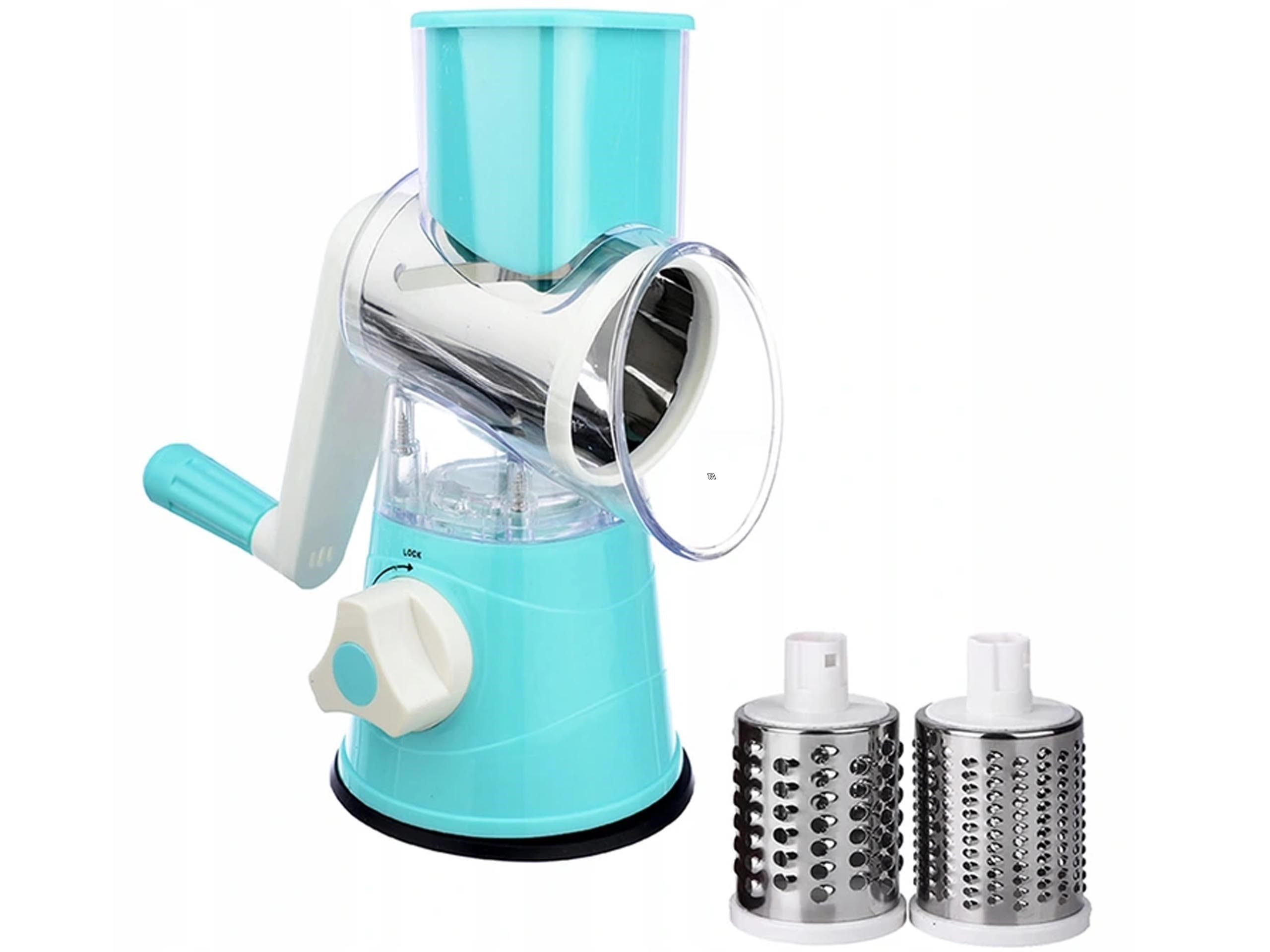 Машина очень проста в использовании. Прикрепляем ее с помощью специальной ручки к поверхности, например, столу или столешнице. Присоска предотвращает перемещение бритвы и устойчива. Слайсер оснащен тремя барабанами. Вставьте соответствующий барабан в прозрачное отверстие устройства и установите рукоятку. Тогда мы легко сможем нарезать любые ингредиенты.