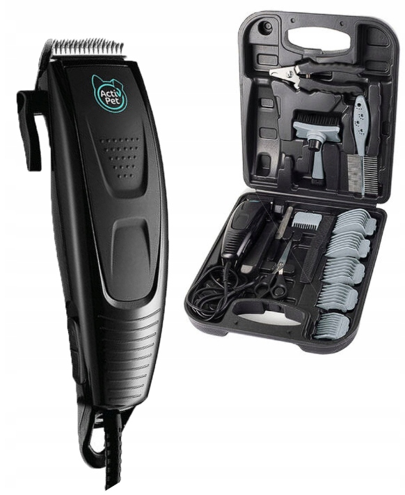 ACTIVE PET Набор с триммером для животных. Набор для ухода за домашними животными. Упакован в практичный футляр для хранения. Машинка оснащена высококачественными лезвиями, предназначенными для стрижки волос. Этот набор просто незаменим для ответственного владельца кошки или собаки.