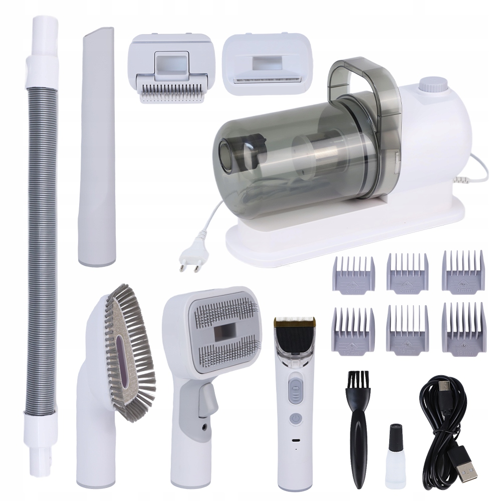 - В комплект для ухода за домашними животными входит набор практичных инструментов: электрическая машинка для стрижки, триммер, расческа и инструмент для удаления волос, щетка для чистки, щетка для волос и насадка.