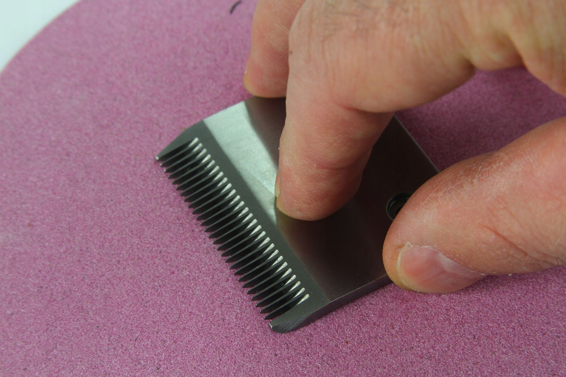Продуманная конструкция позволяет затачивать ножи самостоятельно, без необходимости их замены или отправки на специализированные заводы. Просто демонтируем лезвие, откручиваем два винта и ножи разбираются (разделяются). Для заточки мы используем мелкозернистый каменный диск или мелкую бумагу на водной основе, положенную на стекло или что-нибудь плоское. Кладем нож на диск, наливаем немного воды и круговыми движениями затачиваем нож.