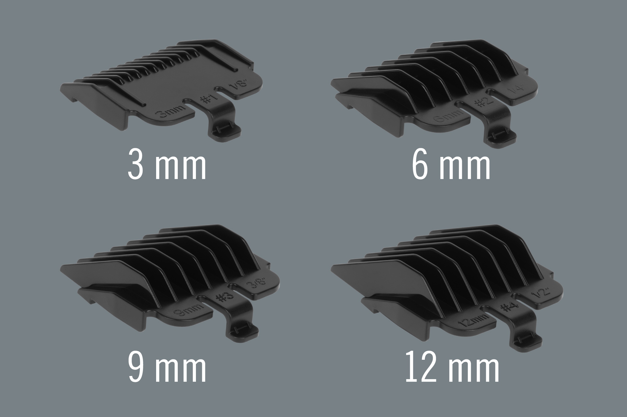 Что, несомненно, облегчит домашнюю стрижку, так это входящие в комплект четыре гребня — 3 мм, 6 мм, 9 мм и 12 мм, — благодаря которым вы легко сможете подобрать подходящую длину стрижки.