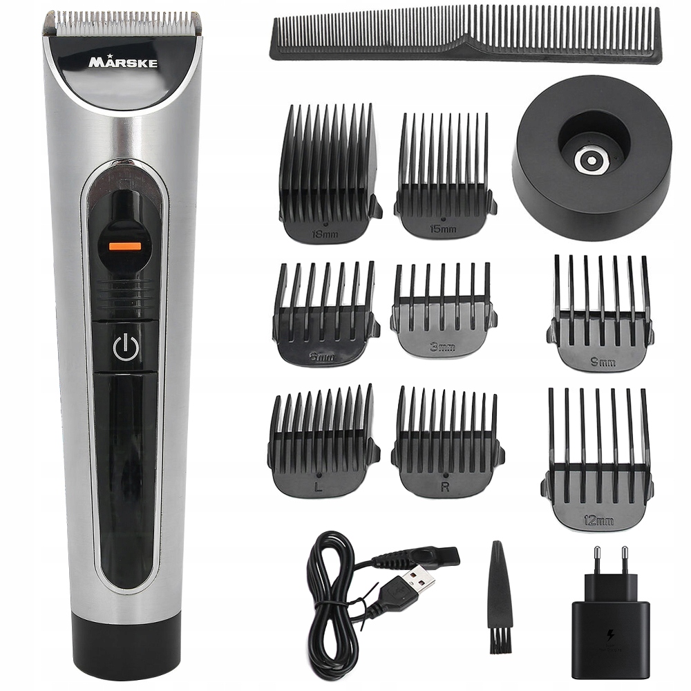 Он идеально лежит в руке и прост в использовании. Кроме того, он также имеет 8 сменных крышек 3 мм, 6 мм, 9 мм, 12 мм, 15 мм, 18 мм + левая и правая крышки. Бритва питается от встроенного аккумулятора, что обеспечивает длительную и беспроводную работу бритвы. Заряжается с помощью USB-кабеля, который входит в комплект. У него также есть зарядная база.