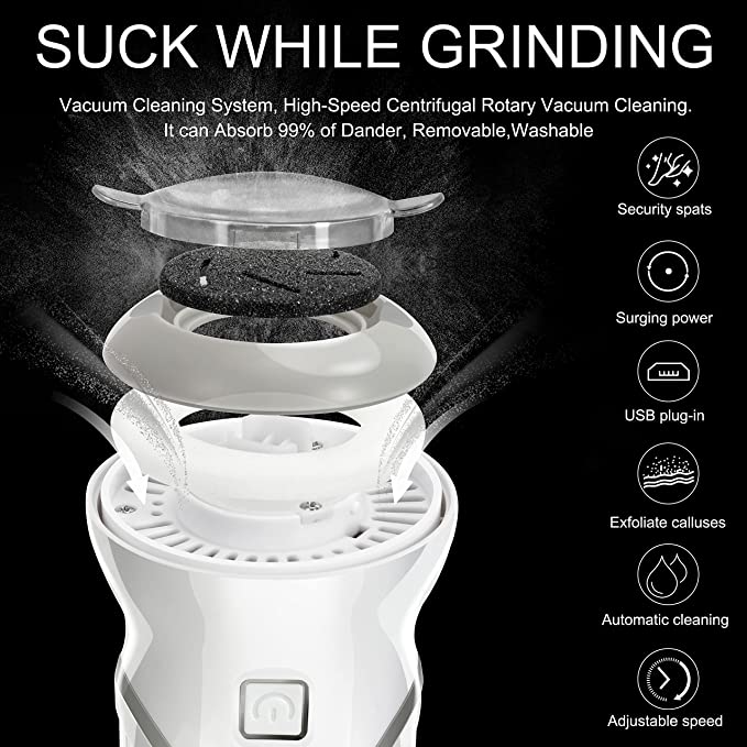 Растущая мощность и автоматическое всасывание: электрический прибор для удаления мозолей стоп с мощным измельчением и всасыванием. Две регулируемые скорости. Автоматически адсорбирует 99 % порошка от перхоти во время измельчения