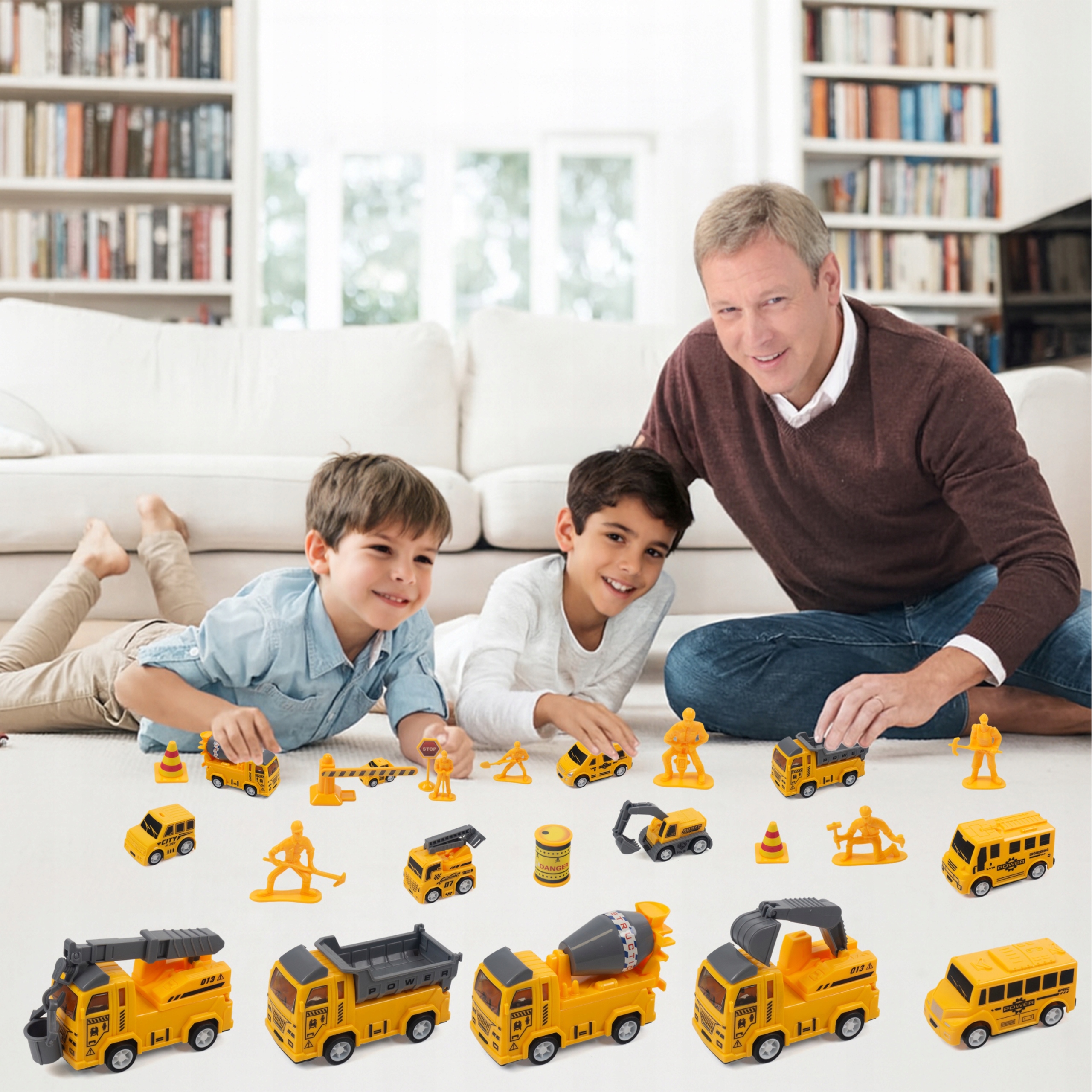Набор строительных машинок из 34 предметов с фигурками и дорожными знаками позволит вашему ребенку сыграть роль инженера. Благодаря механизму обратного хода машины бросаются в бой, а веселье становится полным эмоций и приключений.