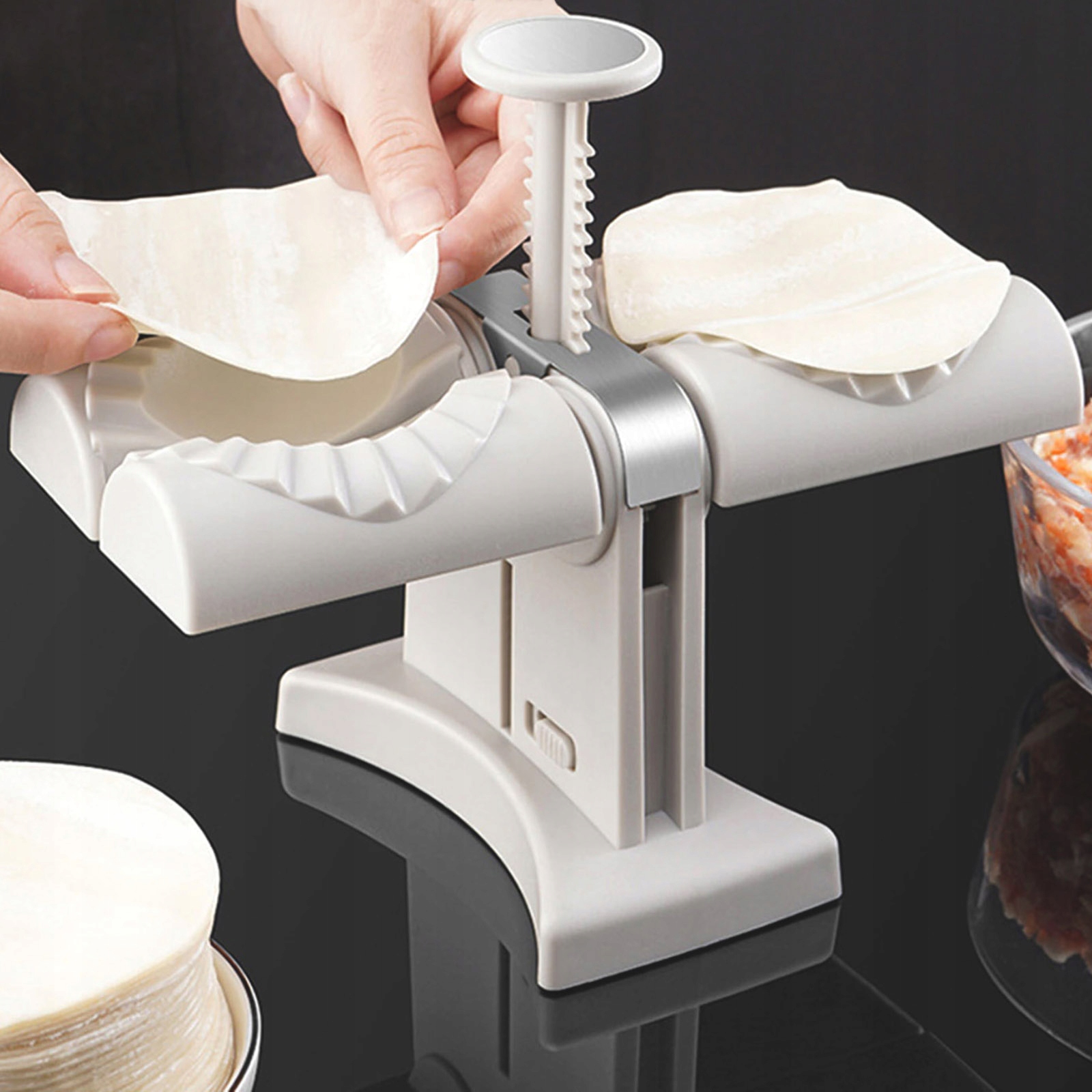 - имеет не -скользящие ножки, благодаря которой повышаются стабильность и безопасность использования и не наносят верхнюю форму пельмени, благодаря автоматическому образованию пельмени.