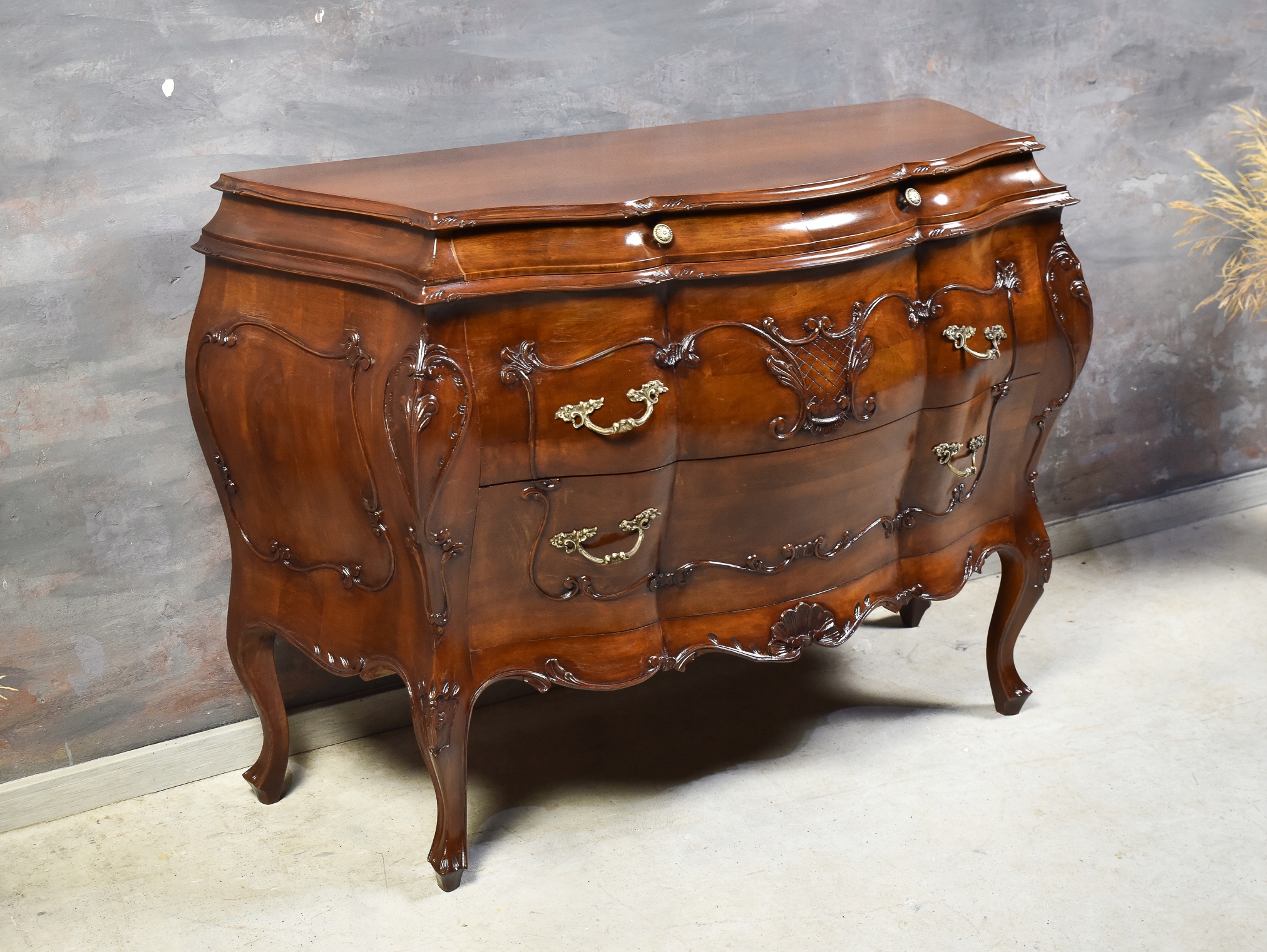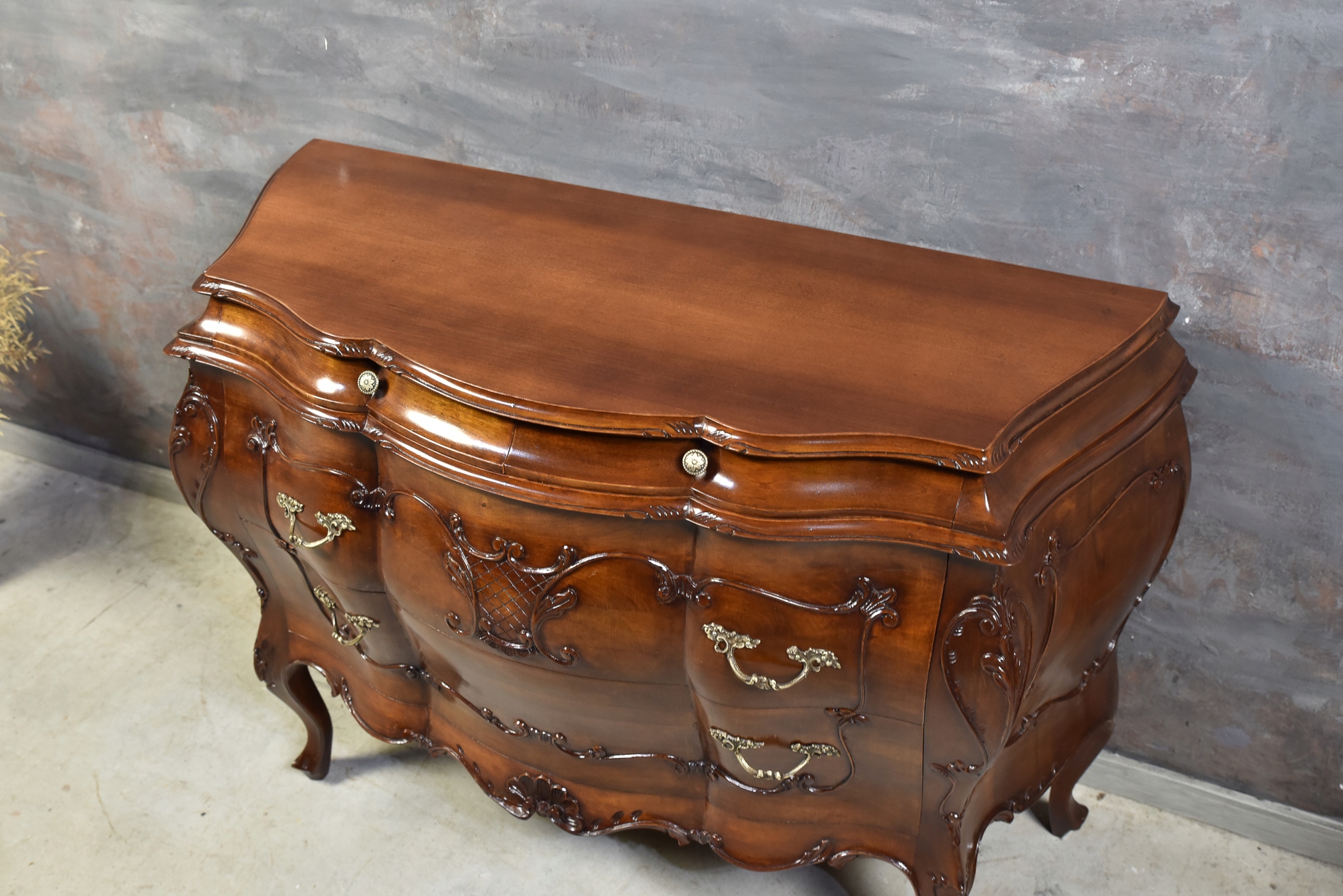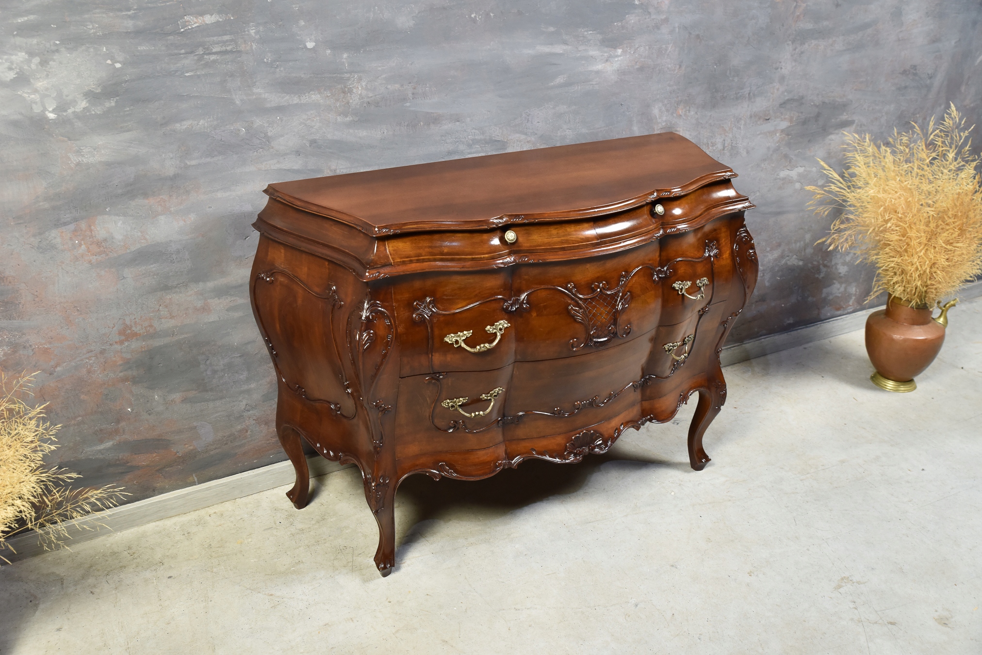 Красиво выполненные вручную украшения и латунная фурнитура придают комоду неповторимый характер. Комод имеет три ящика. Идеально подходит для гостиной или спальни.