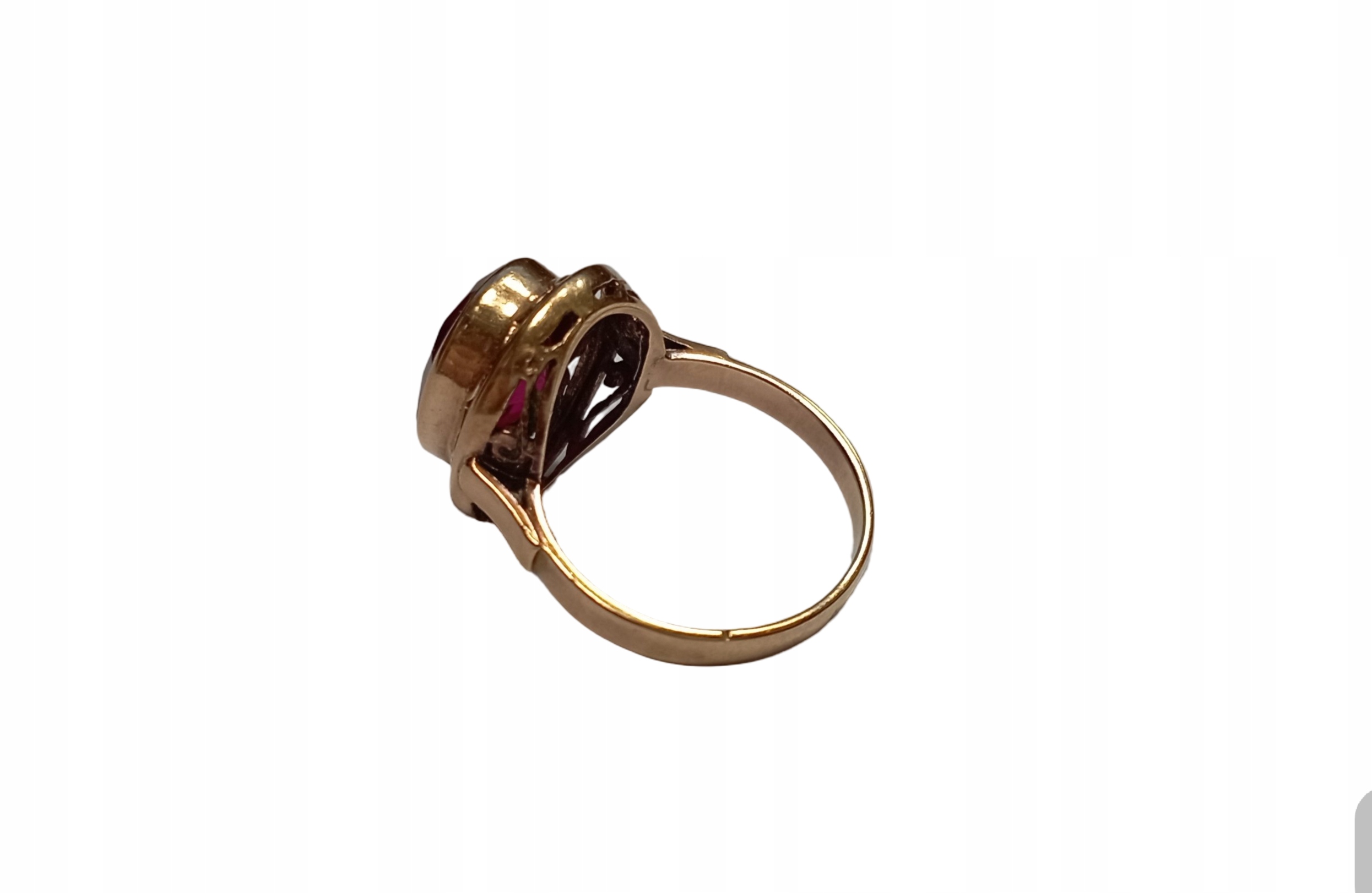 Настоящая находка для любителей украшений с душой! Золотое кольцо с красивым большим глазом насыщенного малинового цвета. Это классический польско-советский дизайн, который никогда не выходит из моды. Ажурная оправа (корзинка) прекрасно пропускает свет, благодаря чему камень невероятно блестит. Состояние винтажное-золото блестит, на камне нет царапин. Идеально подходит для ретро-стиля, но также прекрасно нарушает современный стиль.