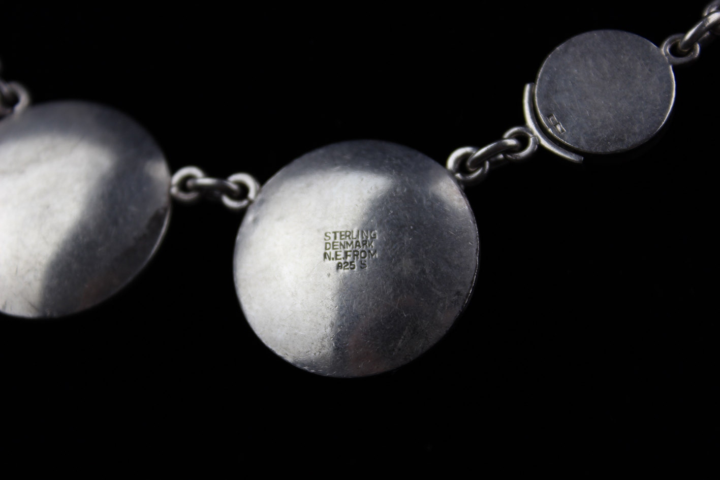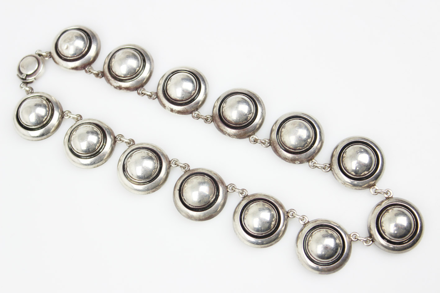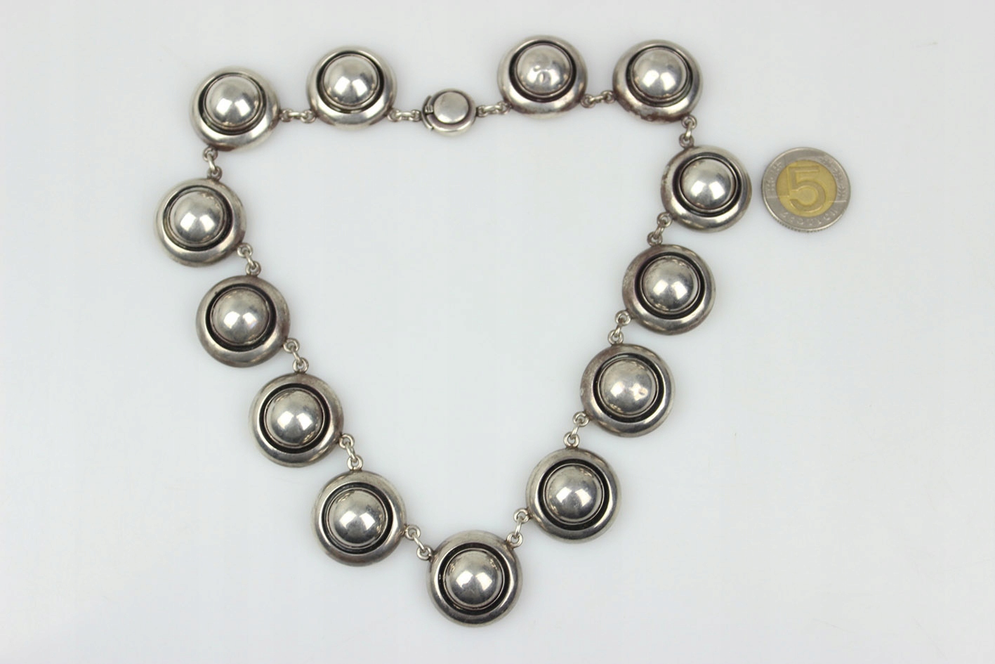 Модернистское датское серебряное ожерелье 1950 -х/60. Из двадцатого века, разработанного известным ювелирным лейблом Нильса Эрика из -за настоящего мастера скандинавского дизайна. Ожерелье состоит из тринадцати массивных, круглых сегментов, которые благодаря их вдумчивому дизайну идеально расположены на шее, подчеркивая уникальную природу ювелирных изделий. Сделано из серебра с высоким тестом, которое подтверждается Punca на обороте: «Стерлинг Дания и 925S». Это обозначение гарантирует как подлинность, так и высокое качество продукта. Оснащен твердым ящиком, который обеспечивает удобство ношения. Историческое обаяние. Это уникальный пример датских модернистских ювелирных изделий, идеально подходящих как для коллекции, так и для особых случаев, где это может быть центральной точкой стиля. ul>