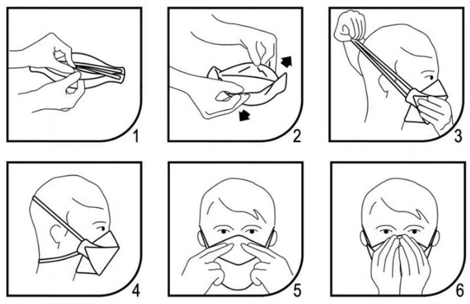 4. Оберните верхний ремень вокруг макушки и поместите нижний ремень под уши. Ленты нельзя скручивать. Отрегулируйте верхнюю и нижнюю панели так, чтобы респиратор удобно прилегал к лицу, убедитесь, что панели и края не согнуты к центру респиратора.