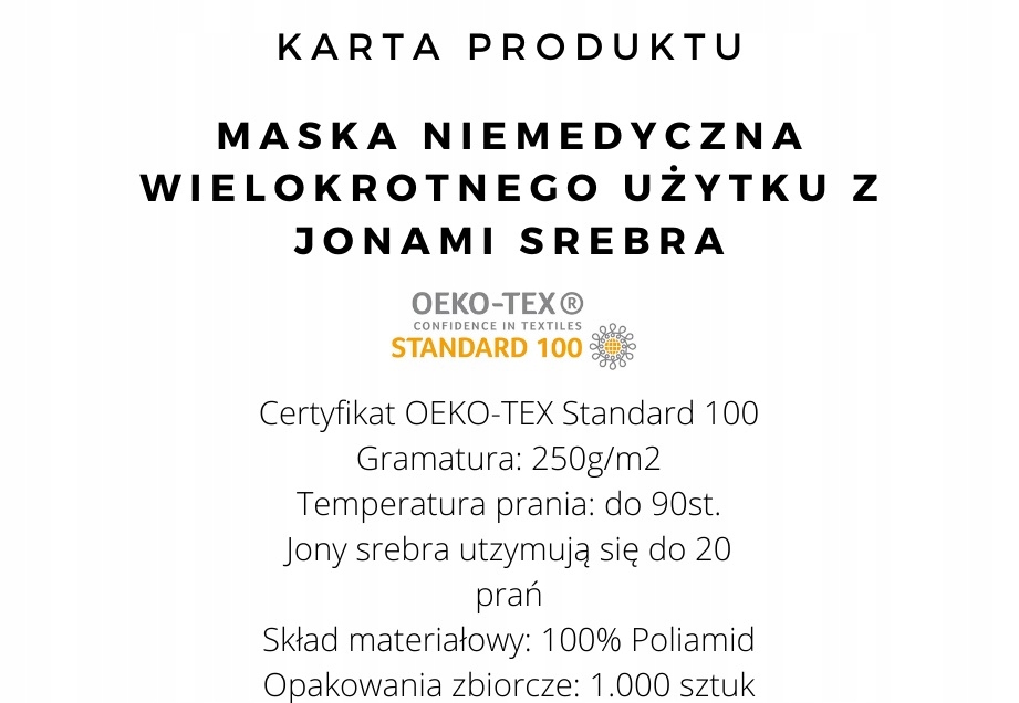 Мы протестировали множество масок, на наш взгляд, эта лучшая, она закрывает уши и адаптируется к лицу. Польское изделие, абсолютно новое, качественное от нашей швейной фабрики. Маска изготовлена из двухслойной полиамидной мультиволокнистой ткани плотностью 210 г/м2. Сертифицированный многоразовый материал, из которого изготовлены маски (OEKO-TEX Standard 100 – сертификат), имеет йонай серебра. Ионы серебра повышают нашу защиту и безопасность. ИОНЫ СЕРЕБРА НАВСЕГДА СВЯЗАНЫ С МИКРОФИБРОВОЙ. Маску можно многоразово использовать. Маска предназначена для защиты от неэкстремальных погодных условий (мелкие капли водяного пара, плавающие в воздухе, пыль). Кроме того, это ограничивает возможность случайного прикосновения к области рта и носа.