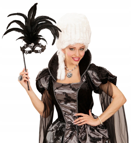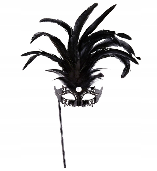MASKA CZARNA WENECKA Z PIÓRAMI NA PATYKU KARNAWAŁ
