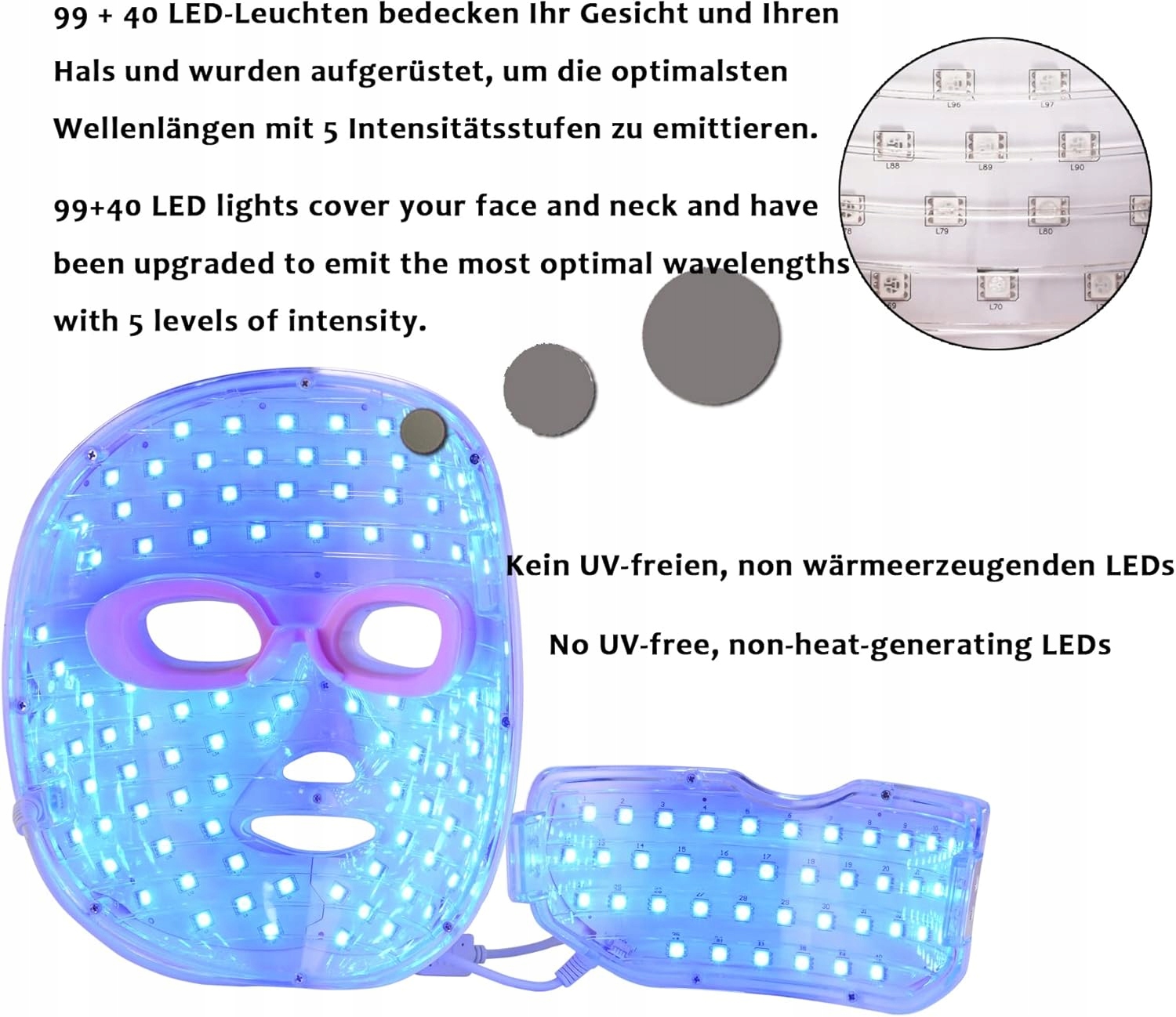 - Коробка управления аккумулятором, беспроводная, легко переносить. 99 + 40 светодиодов покрывают лицо и шею и были обновлены, чтобы выделить наиболее оптимальную длину волны с 5 уровнями интенсивности.