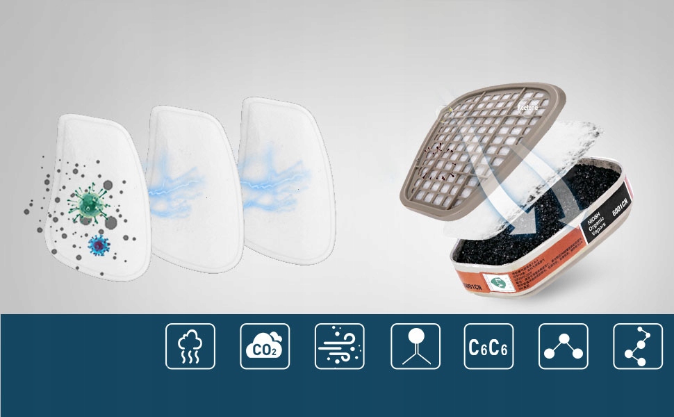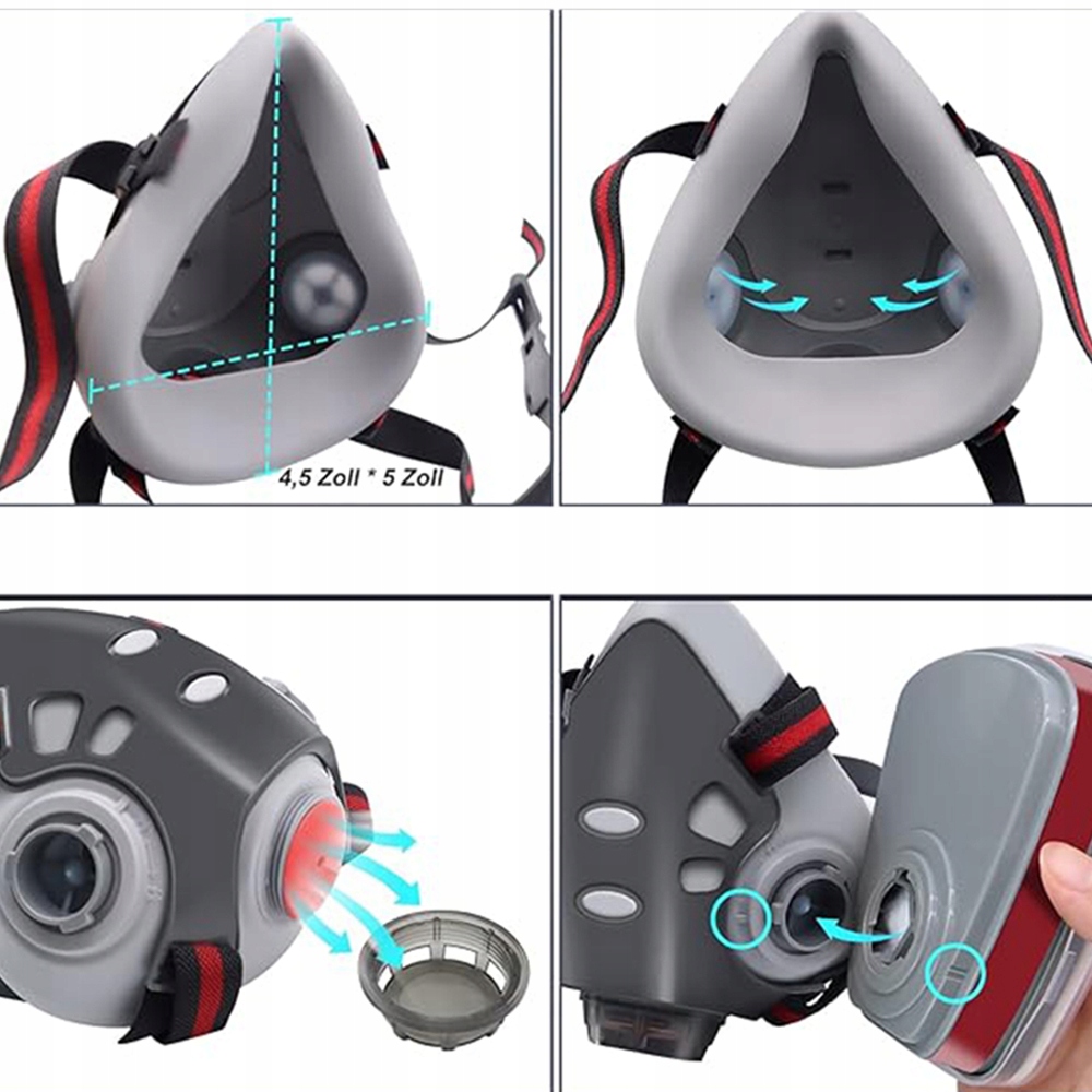 Противогаз с фильтром, гибким и регулируемым оголовьем и маска на лицо подходит для большинства размеров головы. Даже если вы носите очки, очки обеспечивают надежную защиту глаз. Для более комфортной и безопасной работы надевайте пылезащитную маску.