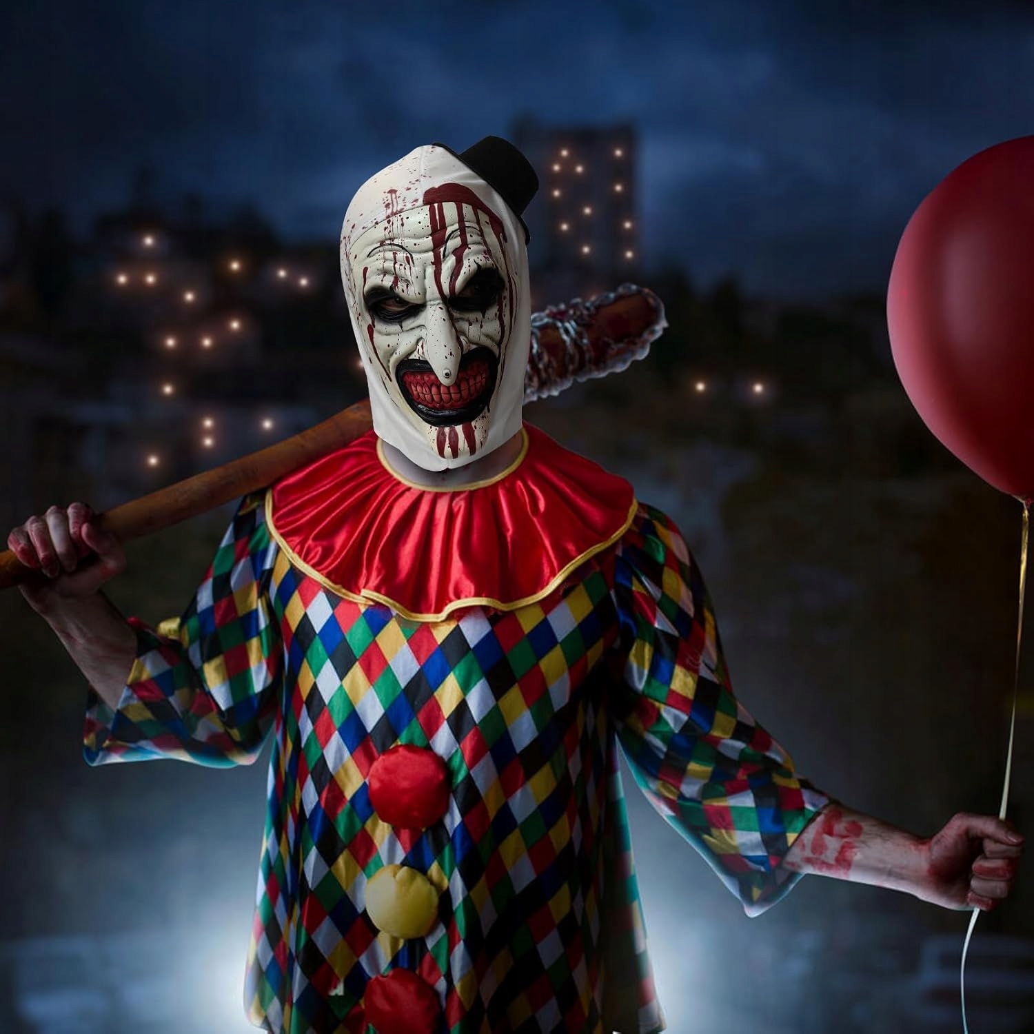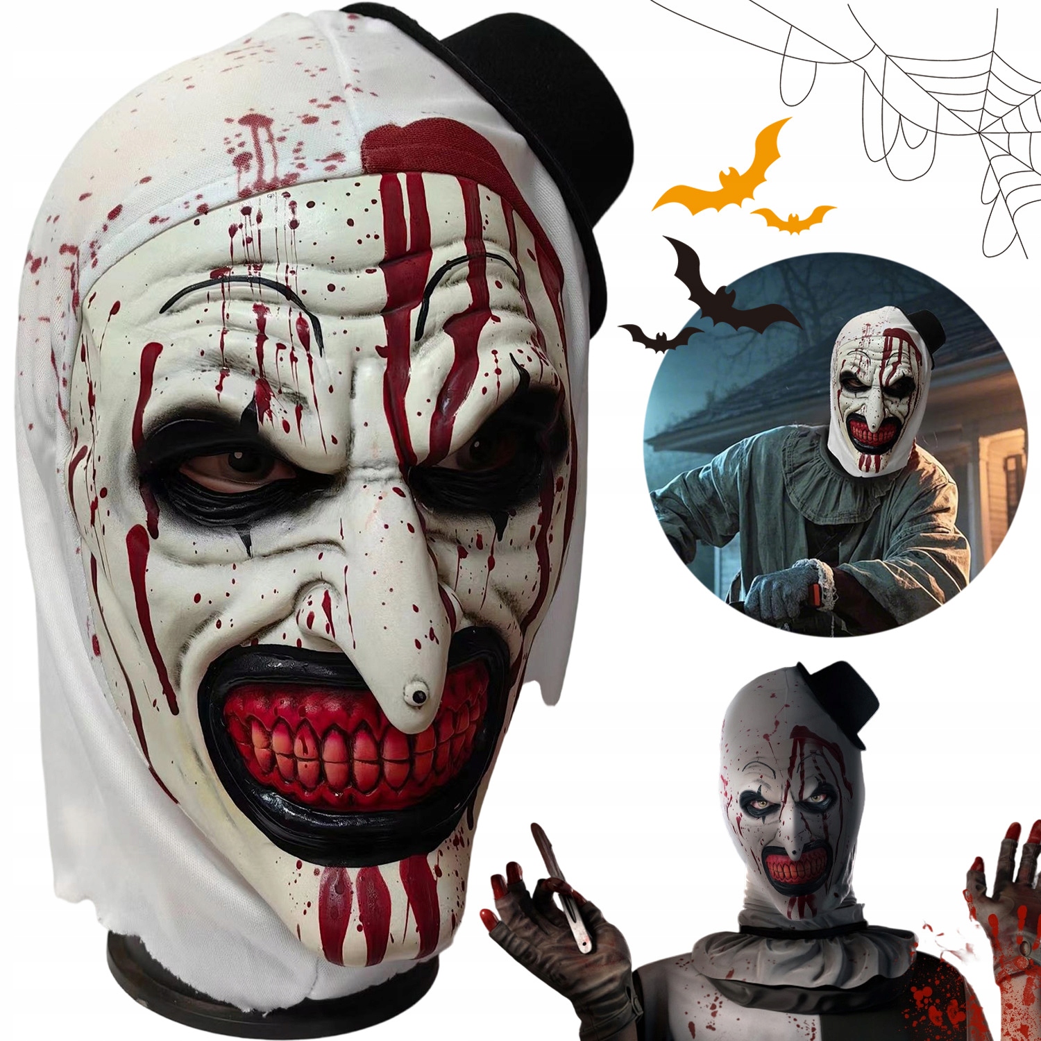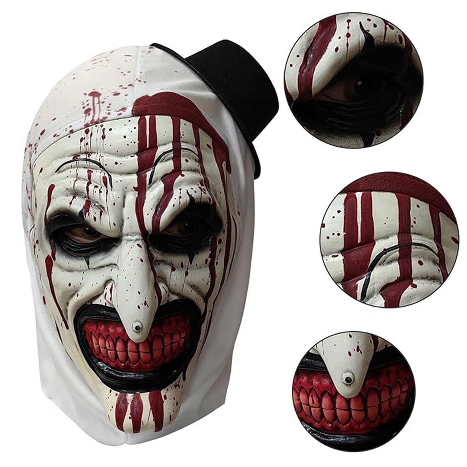 - ✔ Маска клоуна покрыта кровью и имеет трехмерные, реалистичные глаза, нос и губы, создавая ужасающую атмосферу. Форма.
