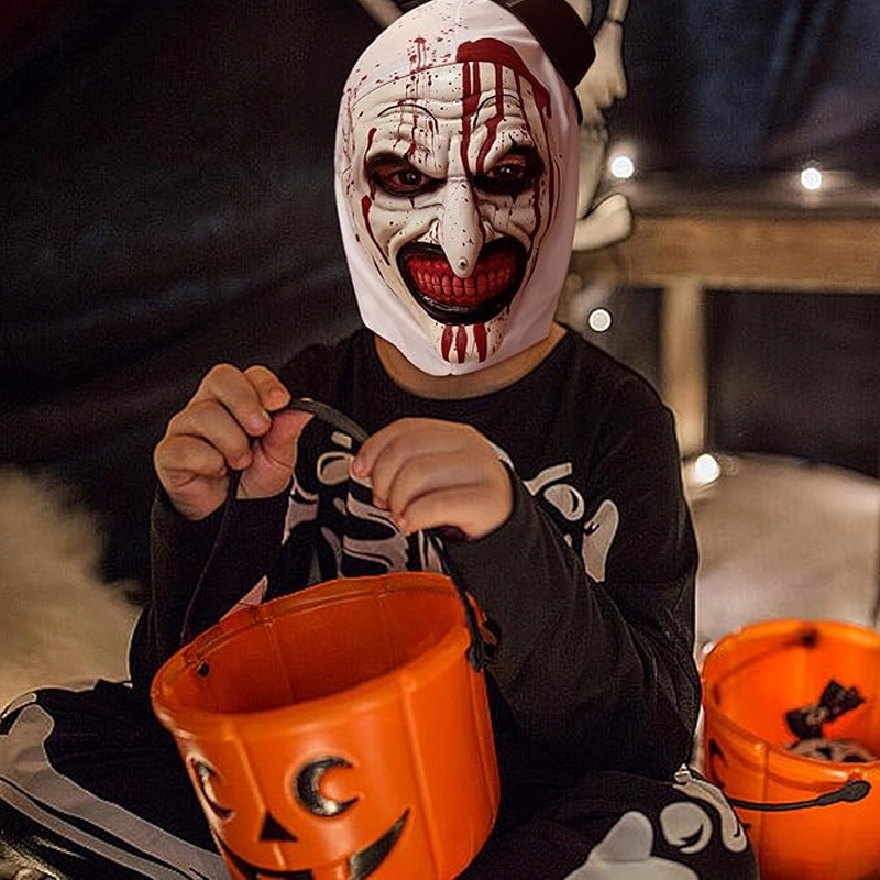 Реалистичный дизайн маски Клауны вдохновлен фигурой Джокера из фильма, воссоздавая ужасающий образ смертельного клоуна из фильмов. Страшная маска смертельного клоуна, покрывающего половину лица, характеризуется реалистичными деталями лица и большой черной шляпой, которая укрепляет призрачное настроение и обеспечивает ужасающий опыт с Хэллоуином.