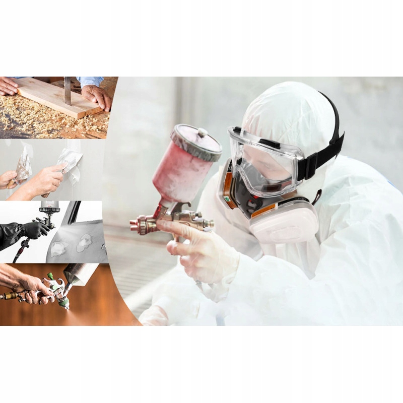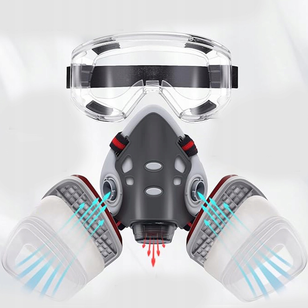 - Противог с фильтром, гибким регулируемым оголовьем и защитной маской подходит для большинства размеров головы. Чтобы работать более комфортно и безопасно, надевайте пылезащитную маску.