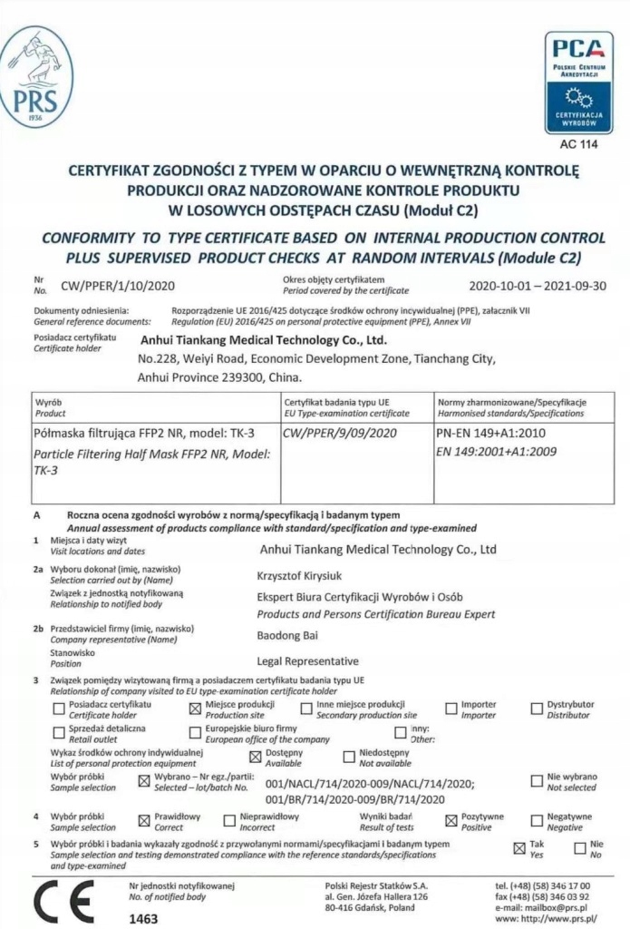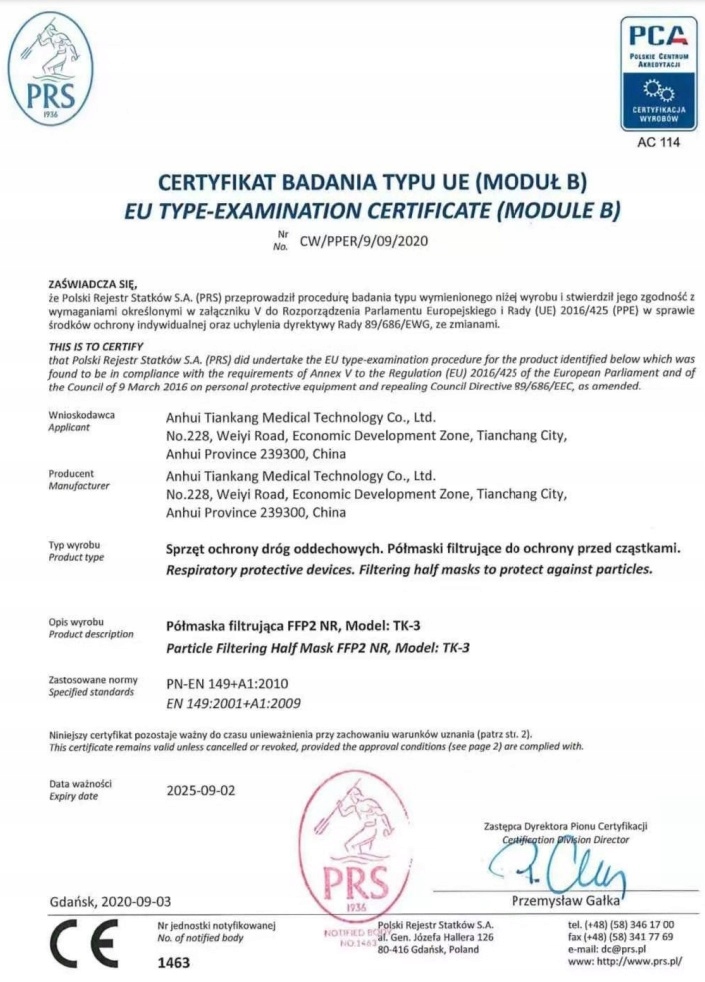 Фильтрующая полумаска FFP2 NR, предназначенная для защиты органов дыхания от твердых и жидких частиц, соответствует требованиям стандарта EN 149:2001 + A1:2009, используемого для демонстрации соответствия гармонизационному законодательству ЕС, т.е. Регламент (ЕС) 2016/425 Европейского парламента и Совета о средствах индивидуальной защиты.