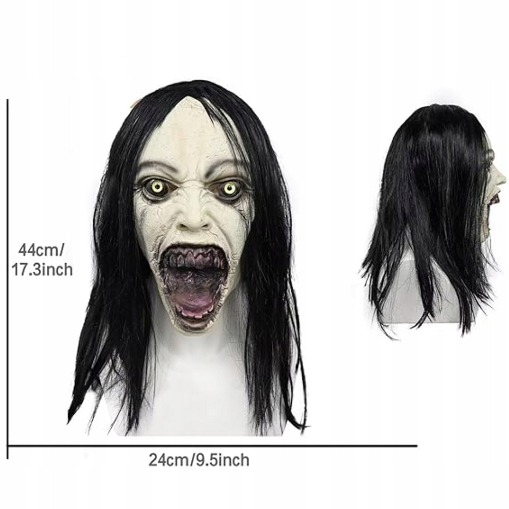 ПОЛНАЯ АУТЕНТИФИКАЦИЯ: латексная маска, закрывающая всю голову, изображающая демоническое женское привидение с искаженным лицом, открытым ртом и распущенными волосами. Эффект чрезвычайно реалистичный и устрашающий со всех сторон!