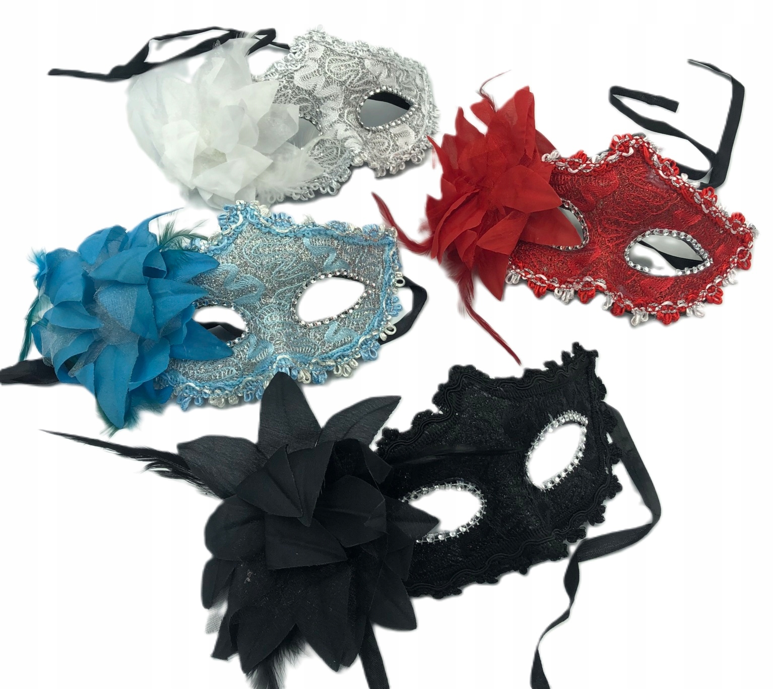 В комплект входят: Венецианские маски, украшенные кружевом и имитацией розы с правой стороны. Маска завязывается лентами на затылке.