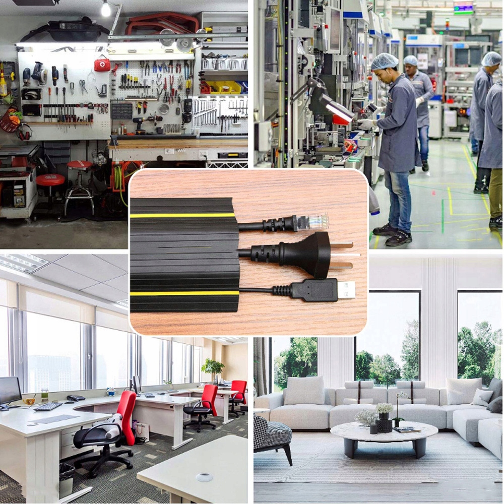 Черный защитник/кабельный канал для пола может легко скрыть и защитить кабели, соединительные кабели и кабели, обеспечивая поддержание чистоты и безопасности поверхности пола. Это может эффективно предотвратить воздействие кабелей, проводов и проводов на внешние влияния.