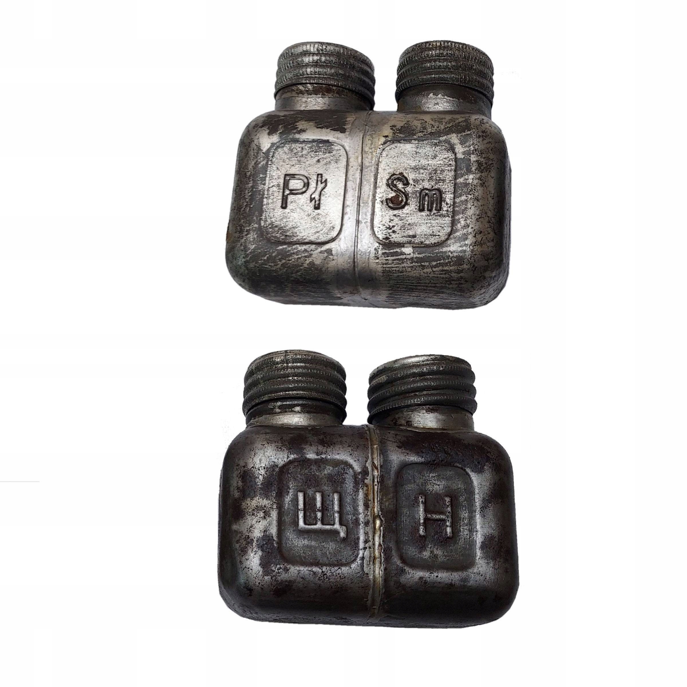 Металлическая масленка из излишков для оружия, например АК 47, КБК АКМ, SWD и других. Масленки могут быть польского или российского производства. Версия с двумя камерами – для очистки жидкости и жира. Масленки не содержат смазочных материалов. Могут быть следы длительного хранения, например, потеря краски, другая маркировка и т. д.