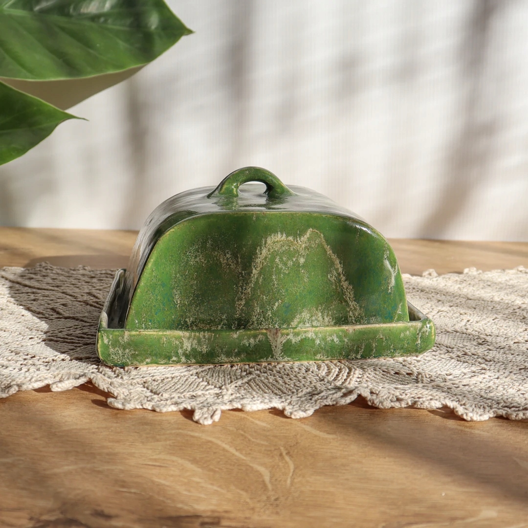 Керамическая масленка в натуральных цветах из коллекции Silver Green. Ручная работа, покрыта снаружи зеленой глазурью с серыми вставками и светло-бежевой внутри с коричневыми пятнами. Удобный и небольшой, он не только практичный сосуд для подачи масла, но и восхищает своим неповторимым шармом.