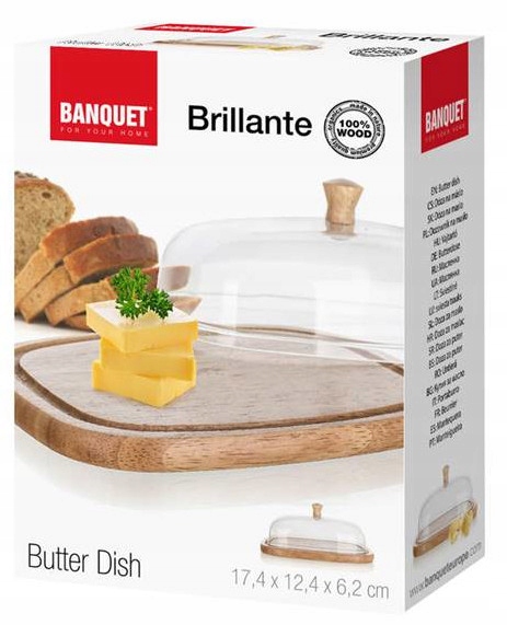 Качественный контейнер для сливочного или сыра Brillante с размерами 17,4 х 12,4 х 6,2 см, поднос с канавкой из высококачественной резиновой древесины, акриловая крышка с деревянной ручкой. Сыр закрылся с крышкой на подносе, остается свежим гораздо дольше и не высохнет
