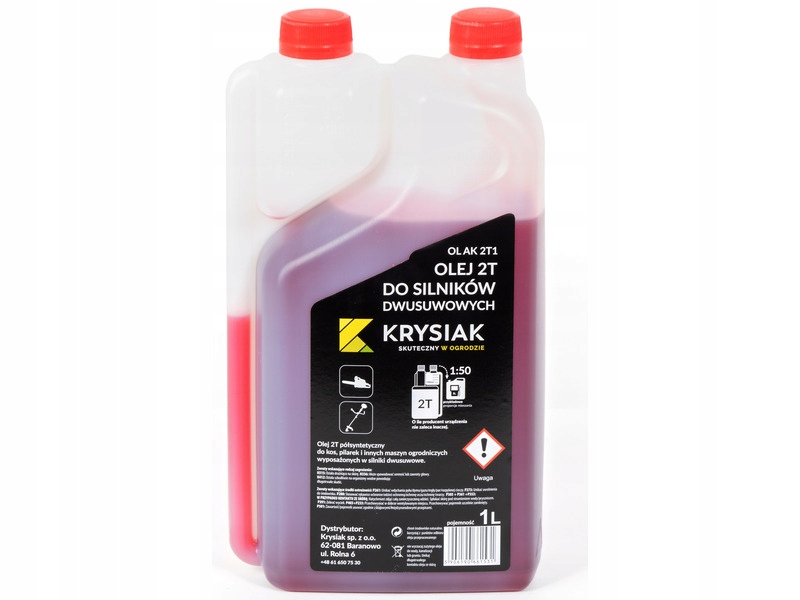 Полусинтетическое масло Krysiak 2T – практичный препарат, предназначенный для использования в двухтактных двигателях. Использование продукта положительно влияет на правильную работу бензопил и кусторезов, что обеспечивает их длительную эксплуатацию. Удобная бутылочка с дозатором облегчит вам приготовление смеси. Благодаря его использованию вы повысите высокую устойчивость двигателя к коррозии и другим механическим повреждениям, что позволит безопасно и эффективно использовать устройства. Для его производства использованы высококачественные масла и рафинеры, которые эффективно исключают появление выхлопных газов и отложений на поверхности двигателя.