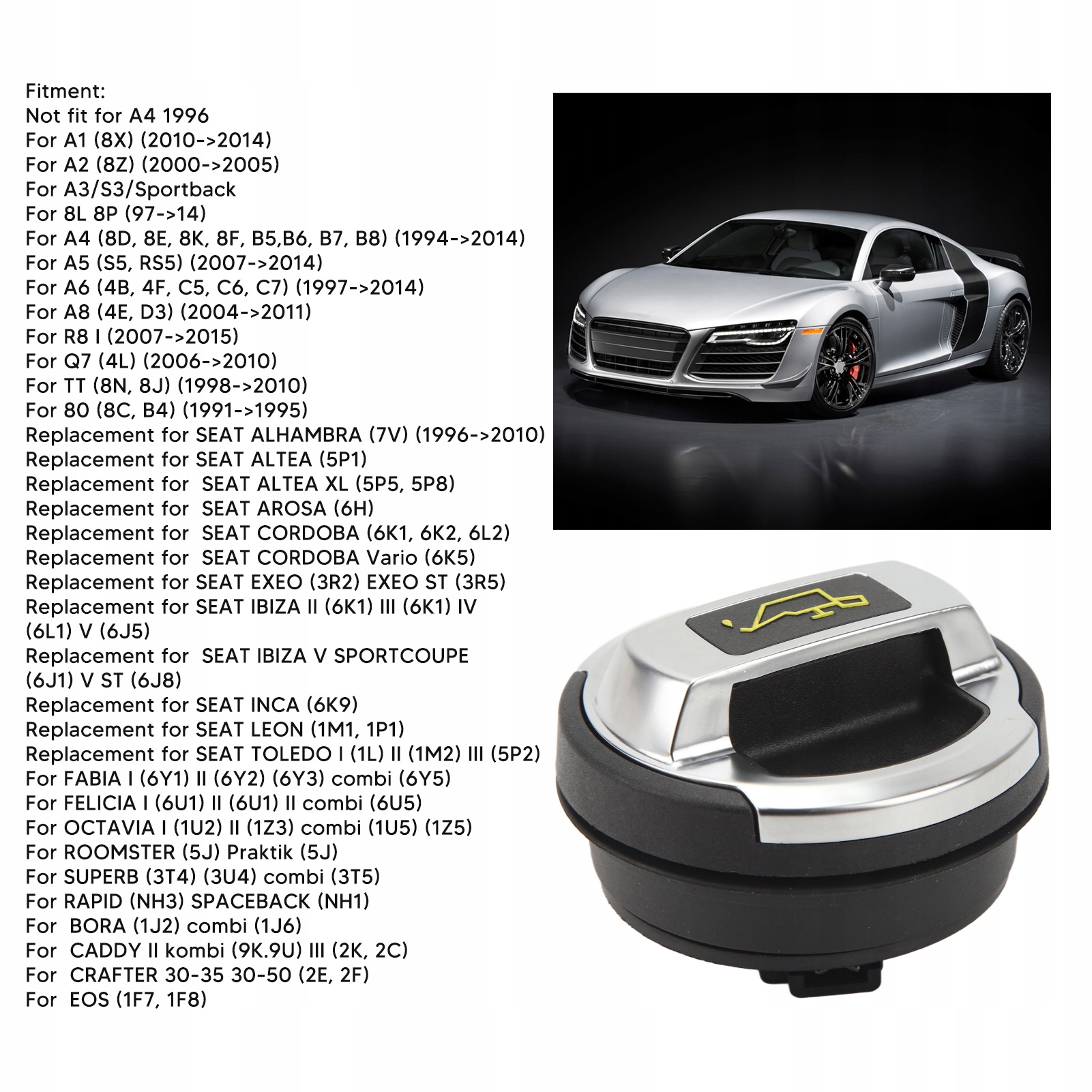 1. Применимые модели: Крышка маслозаливной горловины заменяет сиденье Altea (5p1), A4 (8D, 8E, 8K, 8F, B5, B6, B7, B8) и Transporter III T3 IV T4 V T5.
