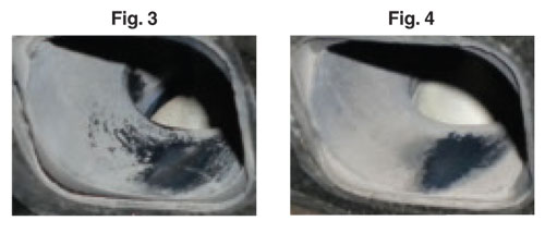 По возможности следует соблюдать рекомендации производителей и проектировщиков двигателей по обкатке. В период обкатки пробег не должен превышать 1500 км. Если двигатель новый, вокруг выхлопных отверстий будет откладываться много масла (рис. 3). По мере прилегания колец масла выходит все меньше и замасленная площадь становится меньше (рис. 4). Когда кольца окончательно сядут и между стенками цилиндра установится полное уплотнение, в выпускных отверстиях не останется следов масла. Другой распространенный метод проверки посадки кольца — проверка на герметичность или измерение мощности. Период обкатки зависит от двигателя. После периода обкатки слейте масло и залейте в двигатель синтетическое масло AMSOIL, предназначенное для высокопроизводительных двигателей, соответствующее требованиям производителя.